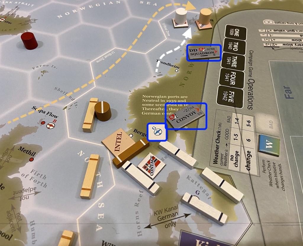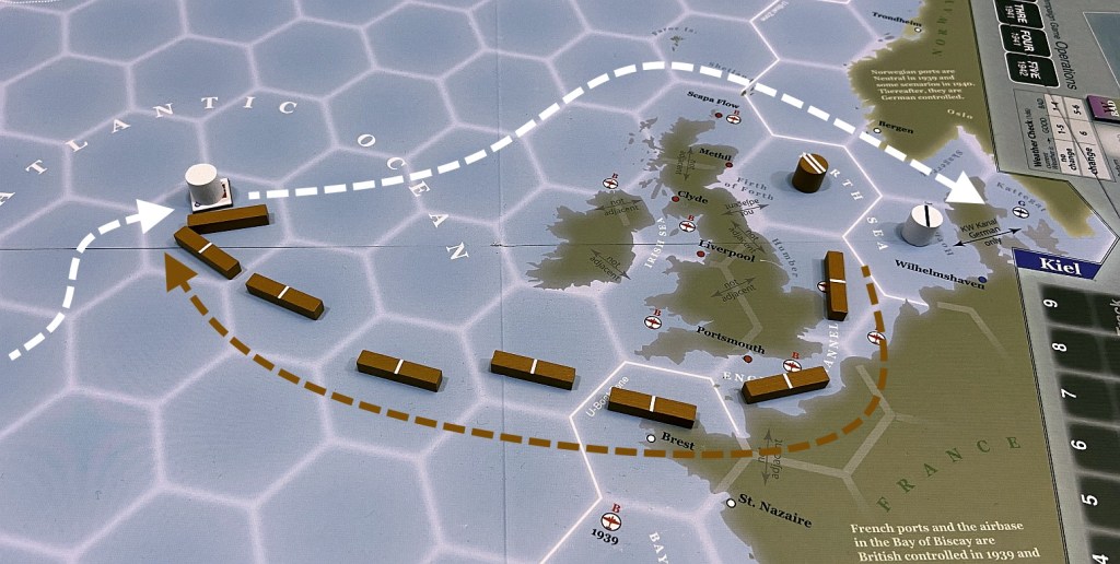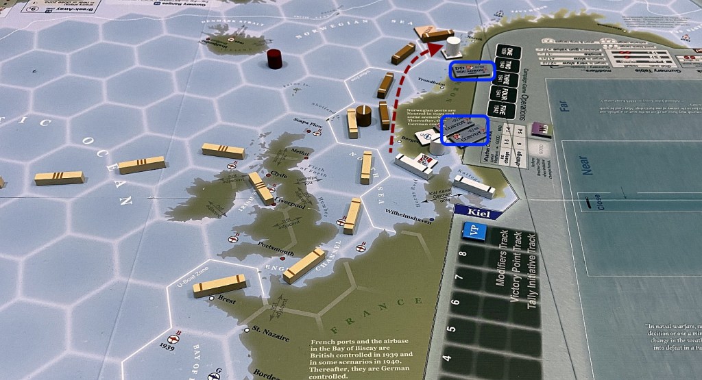 We decided to start with Operational Scenarios – so individual engagements, based on the historical events, where whole story was contained to individual set-up, played for Victory Points or automatic victory. In all below reports I will be in the lead of Kriegsmarine while Jakub will command Royal Navy. Be aware – this will be AAR saturated with many pictures, using various graphical indicators – like arrows – to represent the game dynamics. You can click on each of them to enlarge. I hope you will enjoy it!