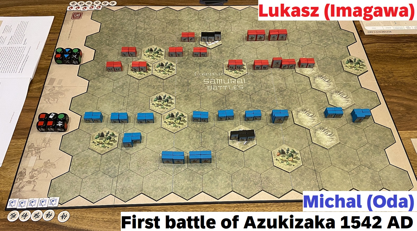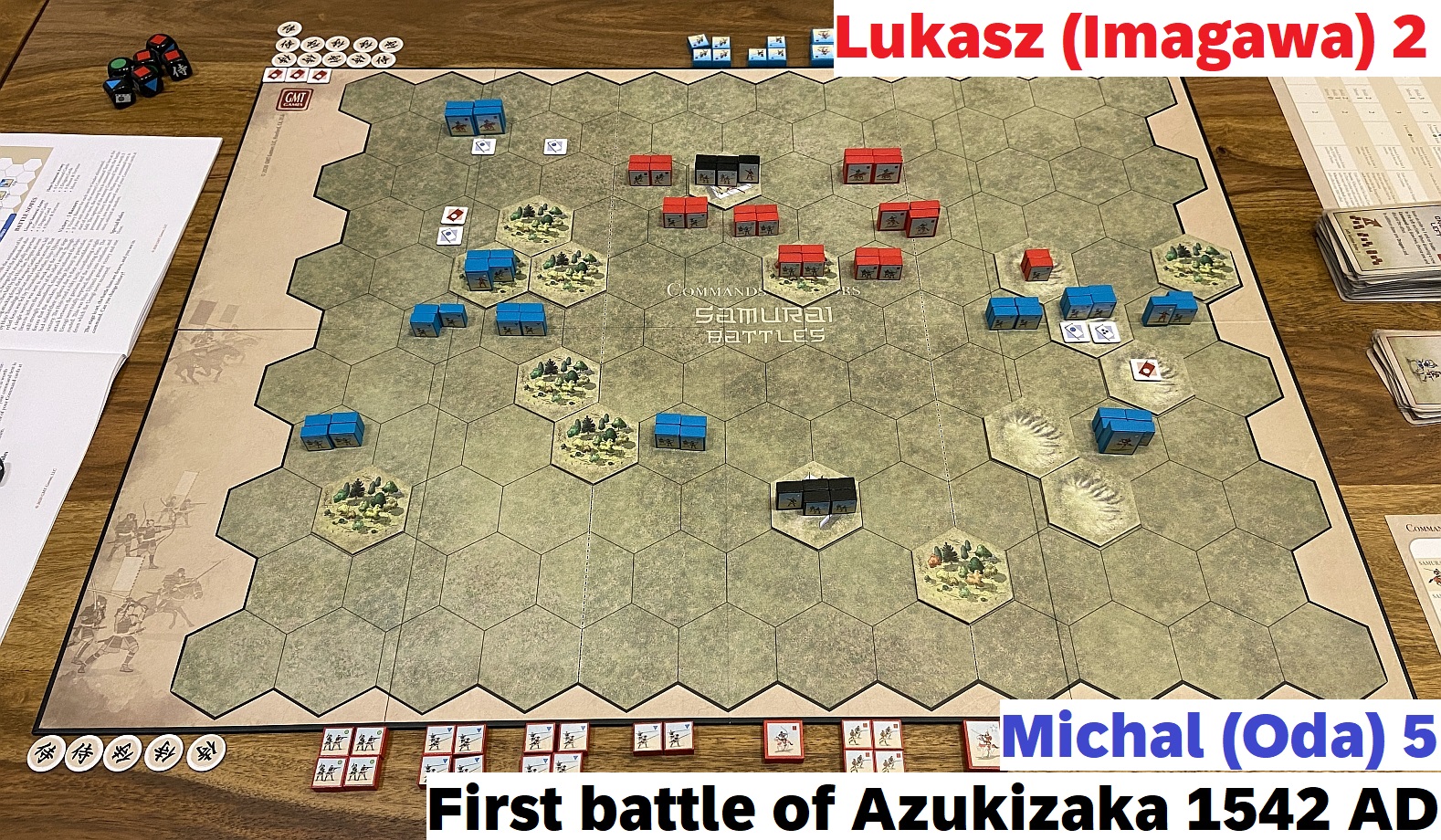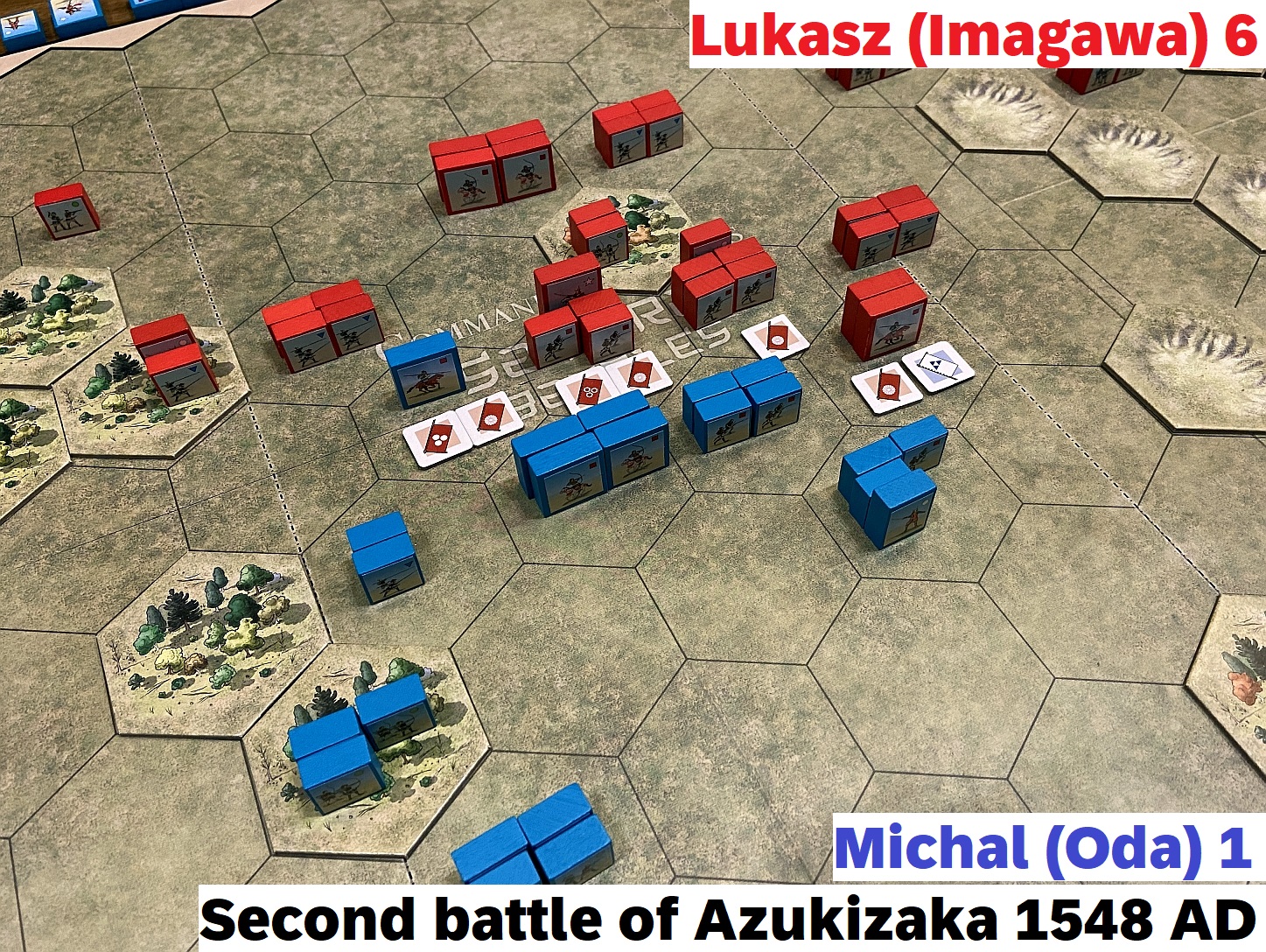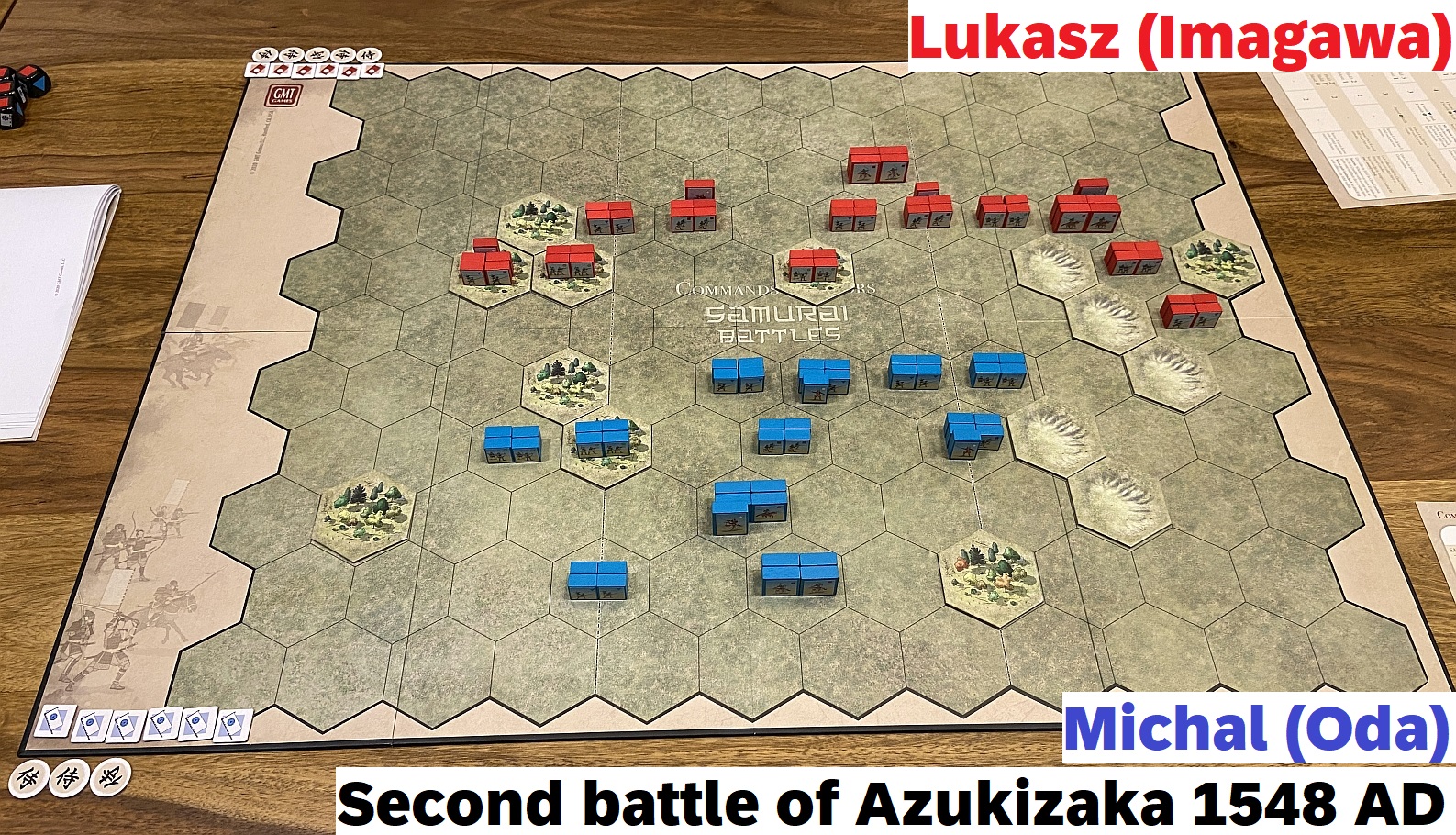 So that another meeting with Lukasz and session with Samurai Battles was planned as a group of the the linked, chronological and logically connected scenarios. As mentioned, we have chosen Azukizaka battle. What is very interesting and special about that mini-campaign is that it uses exactly the same terrain features and units in both battles – it is the units disposition & cards number which make a difference. Pretty interesting approach and a complete novelty to me. I was to play the more difficult side (blue blocks, Oda) while Lukasz will be of charge for slightly stronger army (red block, Imagawa)