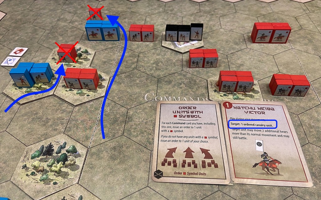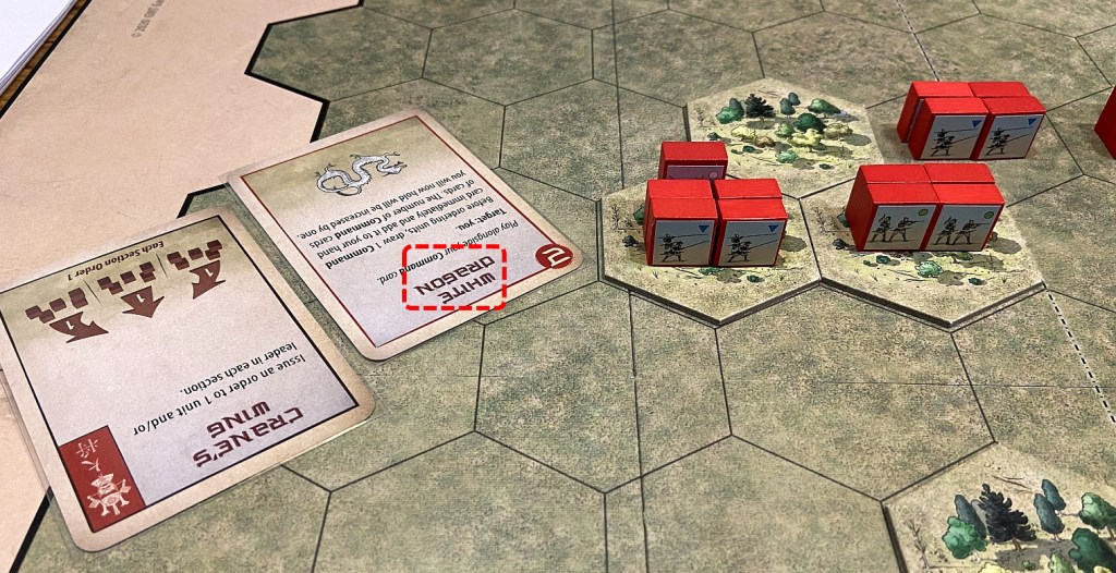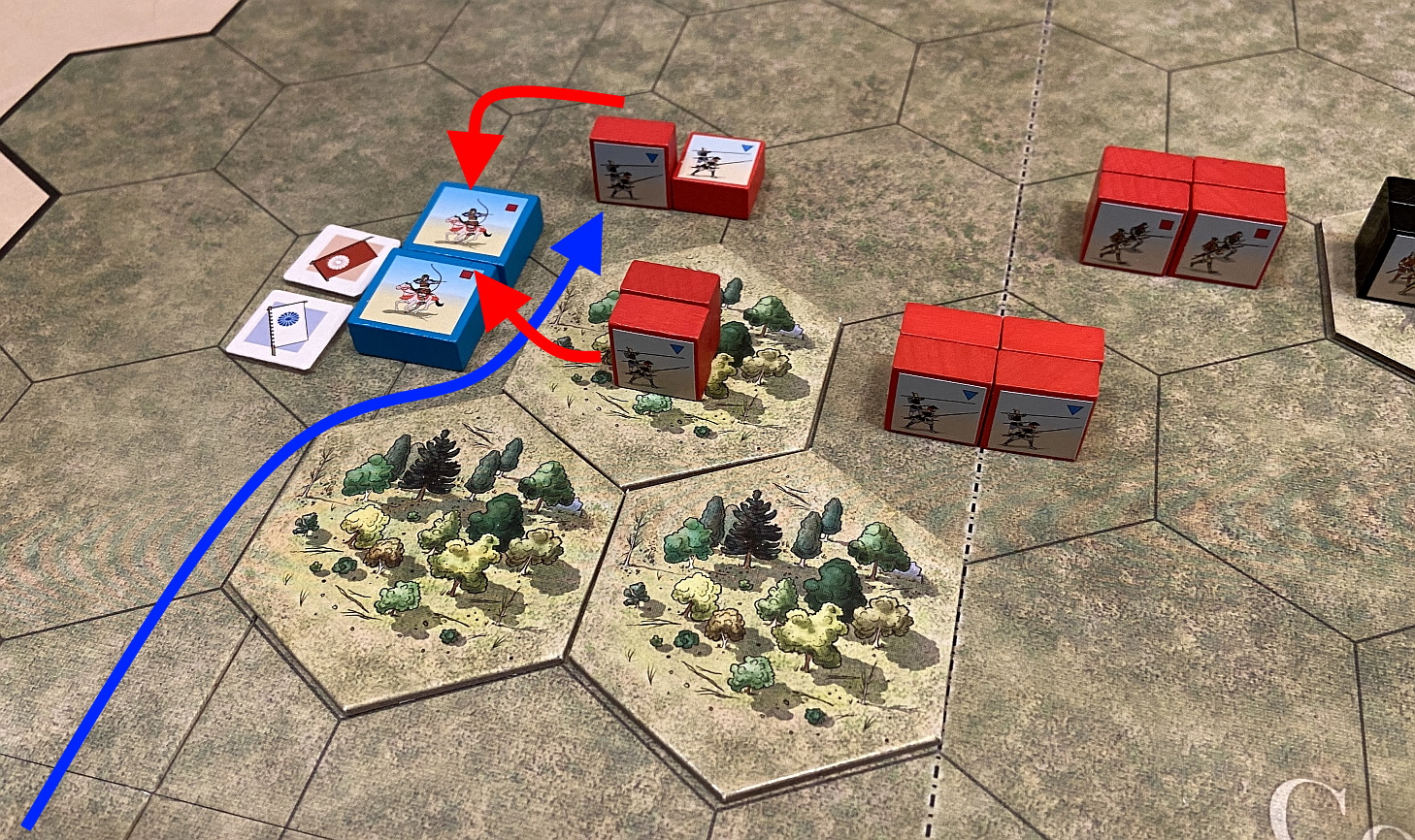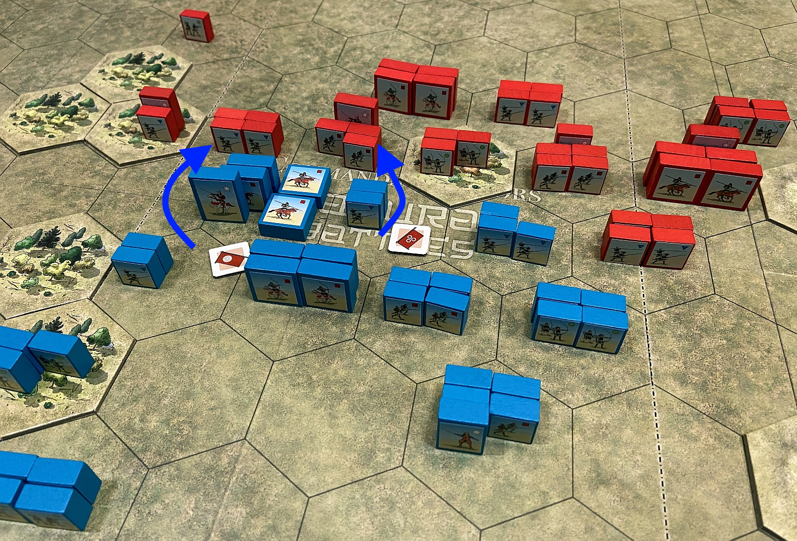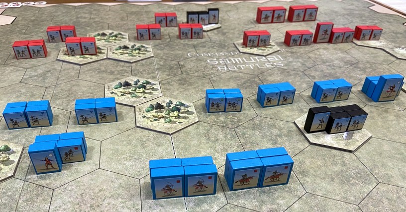 So that another meeting with Lukasz and session with Samurai Battles was planned as a group of the the linked, chronological and logically connected scenarios. As mentioned, we have chosen Azukizaka battle. What is very interesting and special about that mini-campaign is that it uses exactly the same terrain features and units in both battles – it is the units disposition & cards number which make a difference. Pretty interesting approach and a complete novelty to me. I was to play the more difficult side (blue blocks, Oda) while Lukasz will be of charge for slightly stronger army (red block, Imagawa)