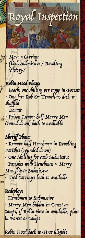 – Victory conditions will be checked – if the Victory Points marker is on the Dark Green section, Robin immediately wins; if on Dark Blue section – the Sheriff finally managed impose Order in the shire