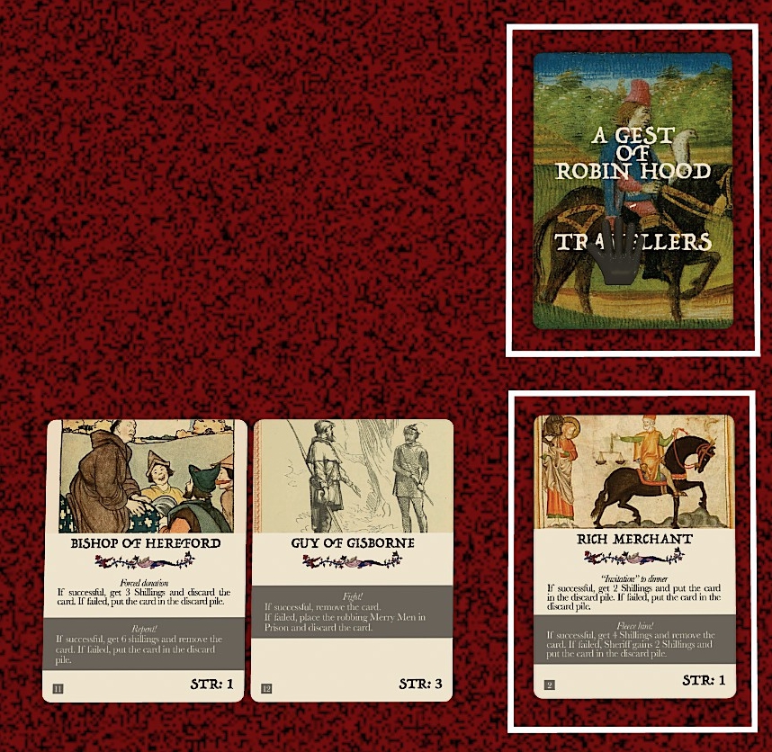 Random encounters with rich travelers: Robin Hood draws from the Travelers Deck when conducting a Rob action, then decides whether to play it safe or demand a larger ‘donation’ with potentially negative consequences.