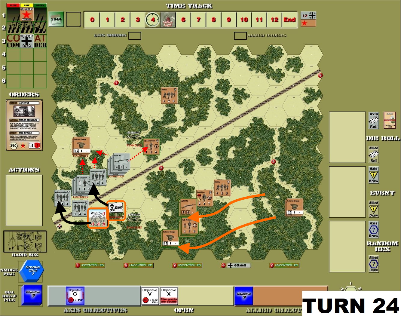 The most crazy element of the game is set-up – each Soviet unit is placed randomly, as per the Random Hex draw at the beginning of the game. Then the Germans can place their units on the map – pretty freely. The partisan activity is severely limited to 1 order per turn. There are no exit points, but double for elimination. The terrain is densely saturated with woods, with limited visibility and lines of sight. Well, that could end only in one way – tons of melee encounters!
