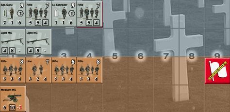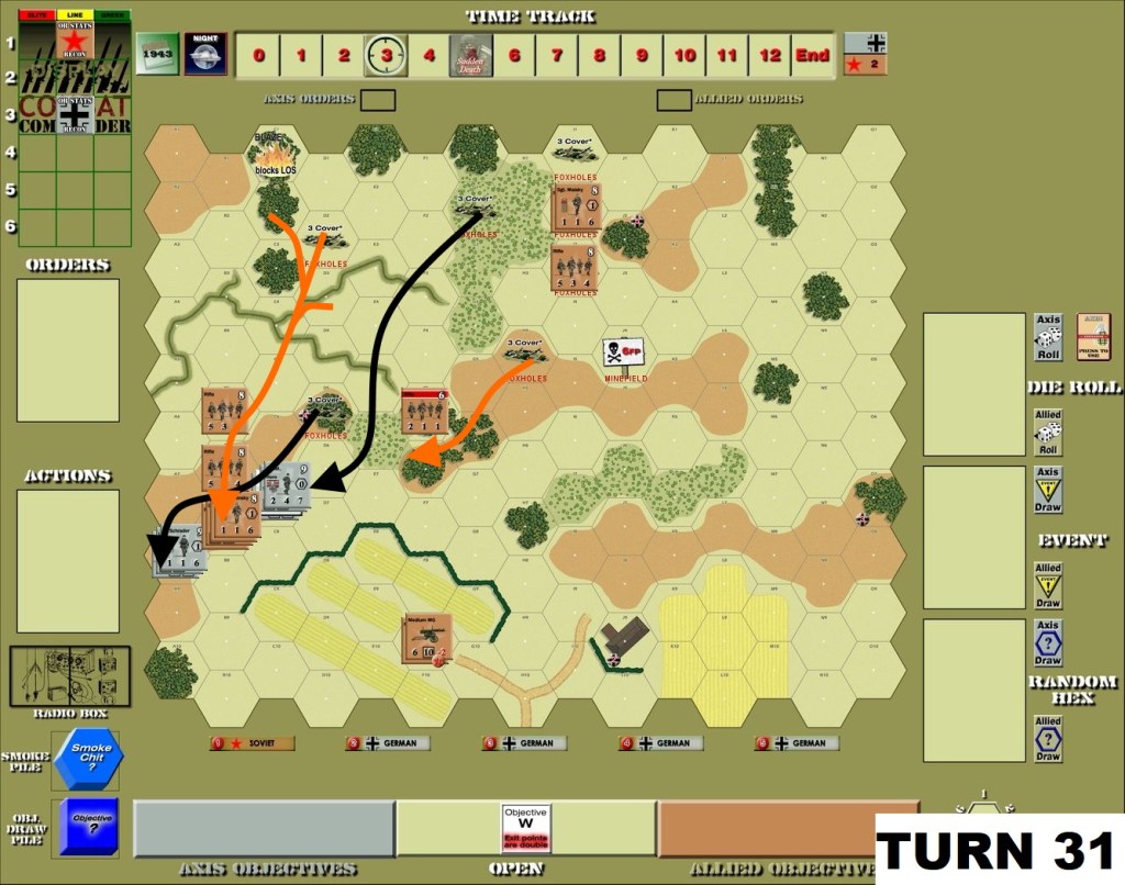 After what looked like a stalemate Dave started to use completely new tactics. He built hand full of Move cards and started to dash between my units! Due to night cover he was successful – it did not help also that my Medium MG was destroyed by the sniper!