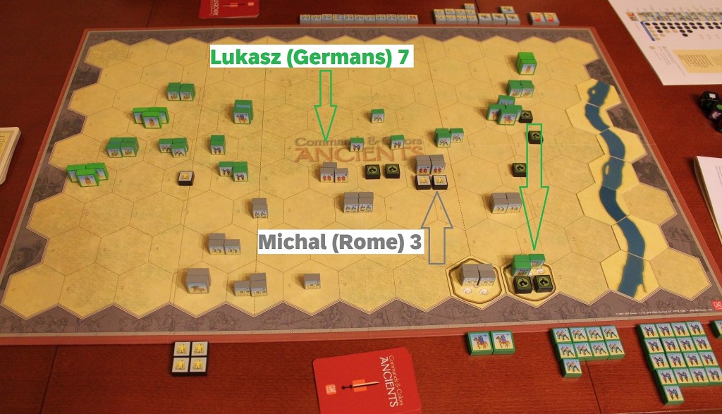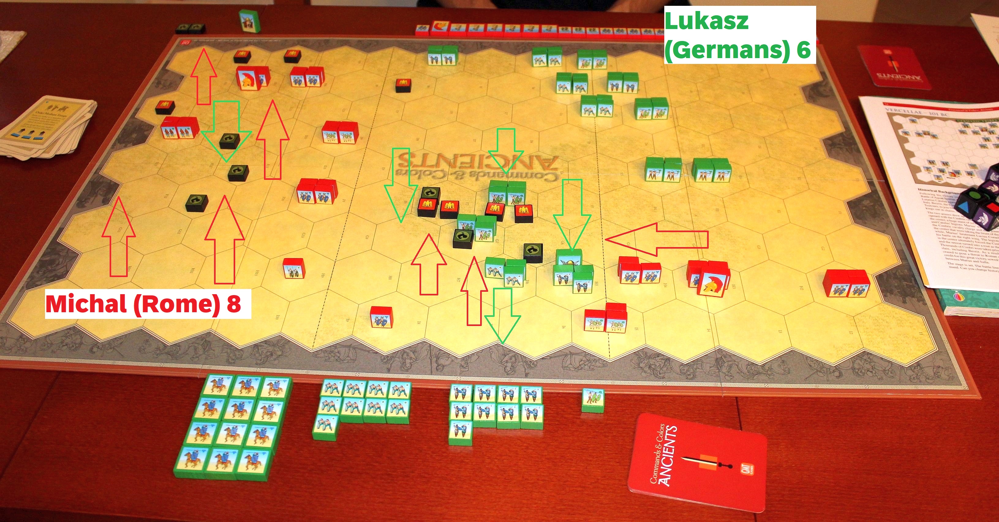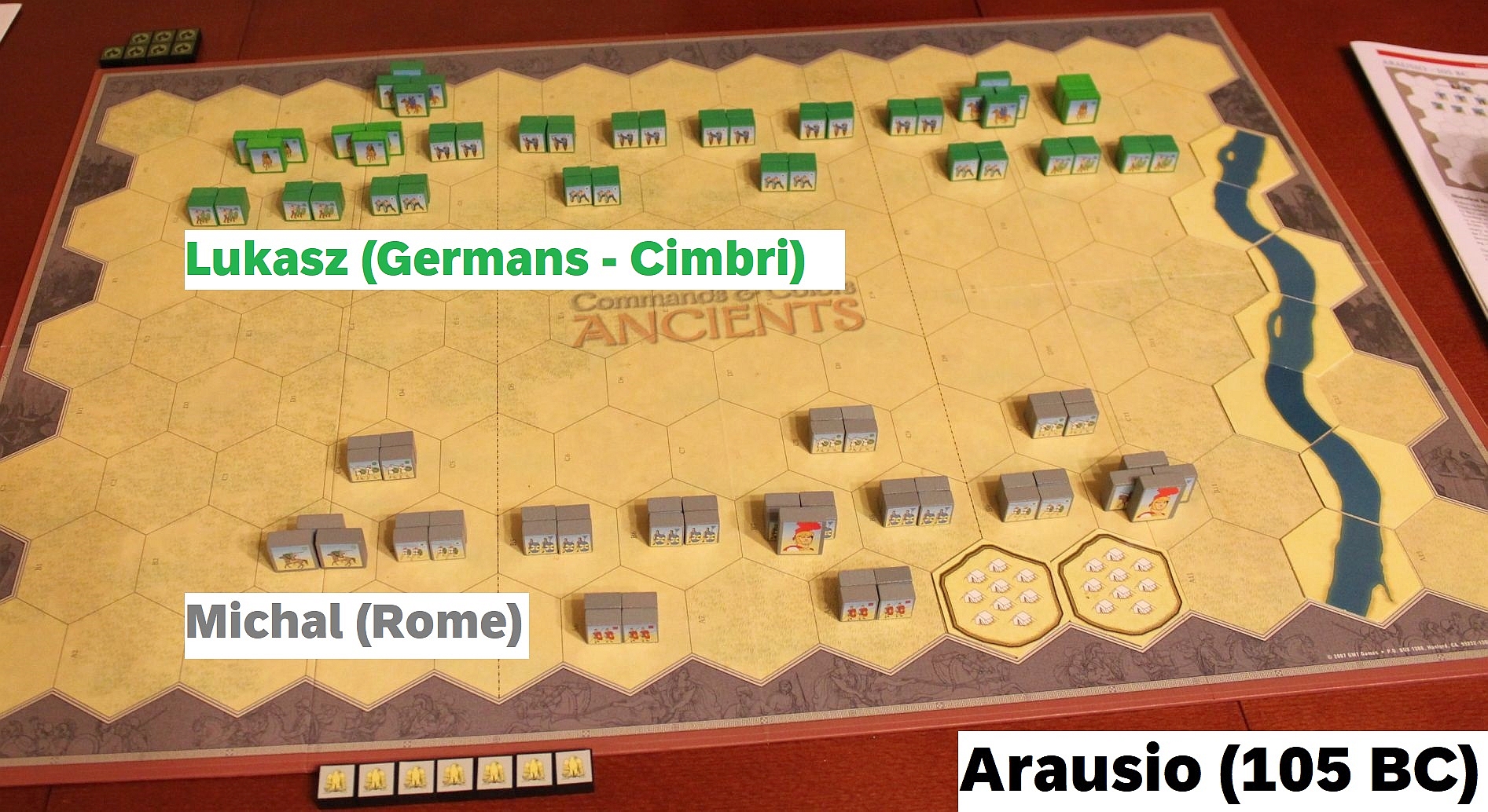 We started with Arausio – the decision was I would lead Romans through all scenarios while Lukasz would be responsible for Germanic tribes. When you look above, the forces seems similar – but be not mislead! I had only 4 Command Cards while Lukasz had full set of 6 Commands at his disposal.