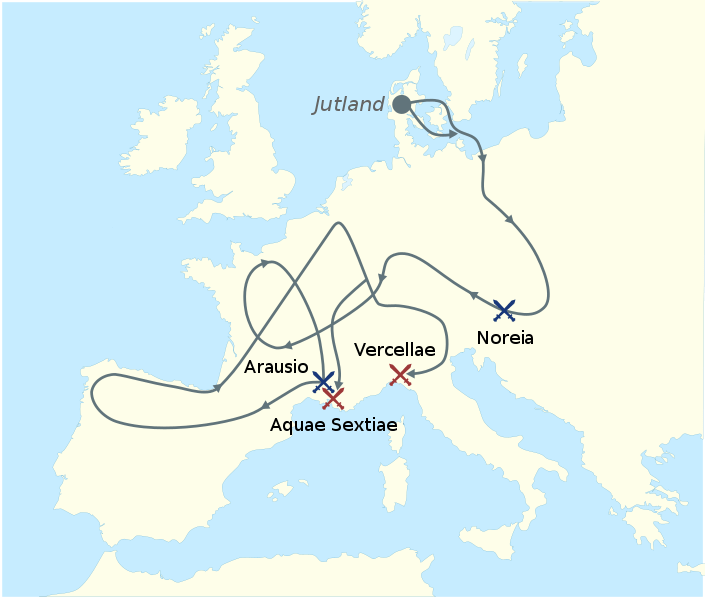 Following the Punic Wars, Rome set out to consolidate the territories it had captured beyond the Alps. At the same time a major migration by the Cimbri, Teutons and Ambrones under the Kings Boiorix and Teutobod was moving south, reportedly with over 200,000 men (a great exaggeration, more likely the fighters numbered about 50,000).