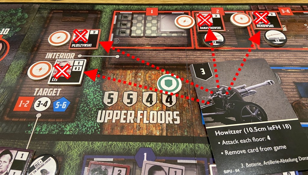 - German Phase – play 5 attack cards. You reveal five Schutzpolizei/SS Cards from the German deck, one at a time, resolving the effect of each one before moving to the next. There are several different categories of Cards, based on the card effect: Assault, Grenade Bundle, Support and Howitzer.