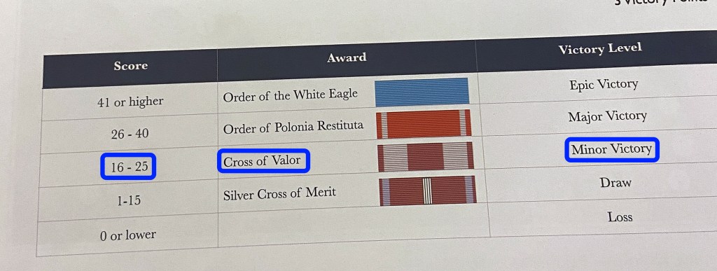 That was game to remember! There were couple of critical moments, when German troops breached the Post Office perimeter. Howitzer and Infantry guns were truly deadly, the MGs pretty accurate. Still, the Defenders held valiantly and I managed to accumulate 24 VPs, equivalent of Minor Victory!