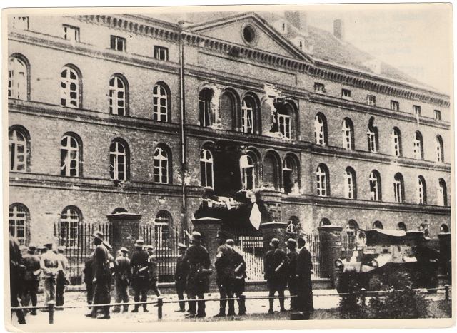 On the first day of the Second World War, German forces moved in to seize Polish installations in Danzig. Two of the installations were on alert and under orders to hold out: the Military Transit Depot on the peninsula of Westerplatte and the Polish Postal Office No. 1. The personnel of the post office repulsed repeated assaults, and were forced to surrender only after a day-long siege, when the post office was doused with gasoline and set alight. Though German propaganda cast these acts of defiance as futile and a failure, they were viewed by the Polish people as symbolic of their stand against a materially superior aggressor.