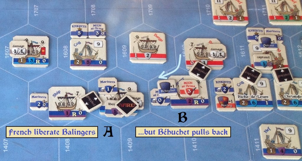 On the French left, Béhuchet’s mariners already aboard some captured balingers liberate them (“A”), bucking up French morale. But nearby, archery onboard the barges that Béhuchet had sought to capture in person take a toll of his accompanying men-at-arms. He retreats with them to the defense of their own ships (“B”)—as their English opponents follow. Melee there, with the Constable’s back to the rails, reduce his fighting men to the last few!