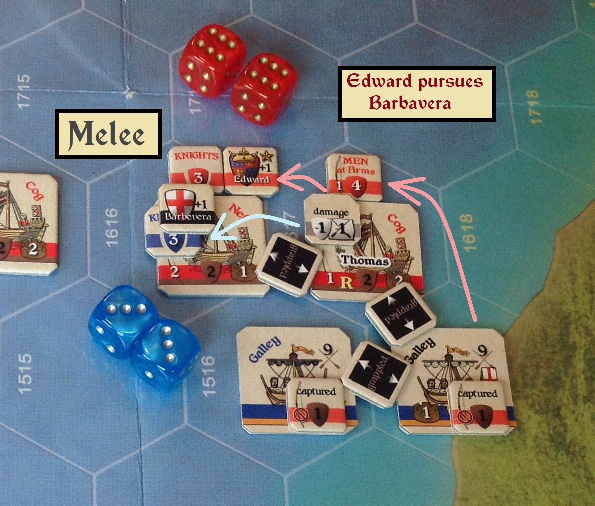 Melee aboard these English ships goes no better for Barbavera, who appears to be making the last stand of his career. But he remains in the fight, and Edward’s knights too are falling (turn 4 ends). (The next image shows the knights units with Edward and Barbavera each with a skull symbol: reduced in the sally melee to its last step of strength.)