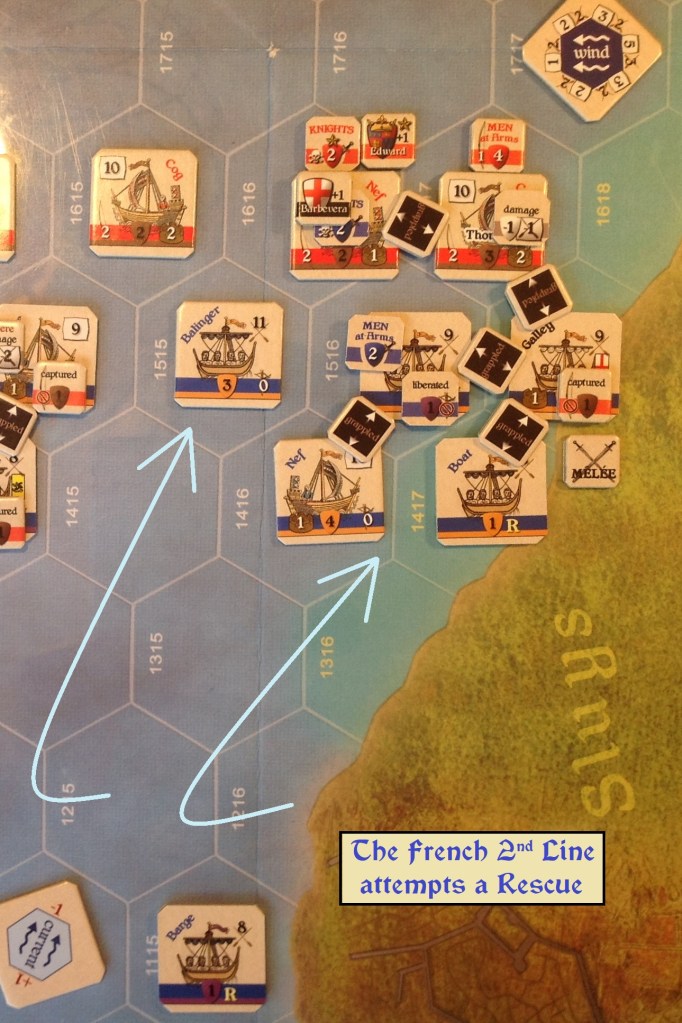 As the hand-to-hand brawl rages on the French left, Edward’s strong squadrons seek to punish Barbavera’s would-be relief. They grapple and hold a few ships. But most of the French right pulls away again.