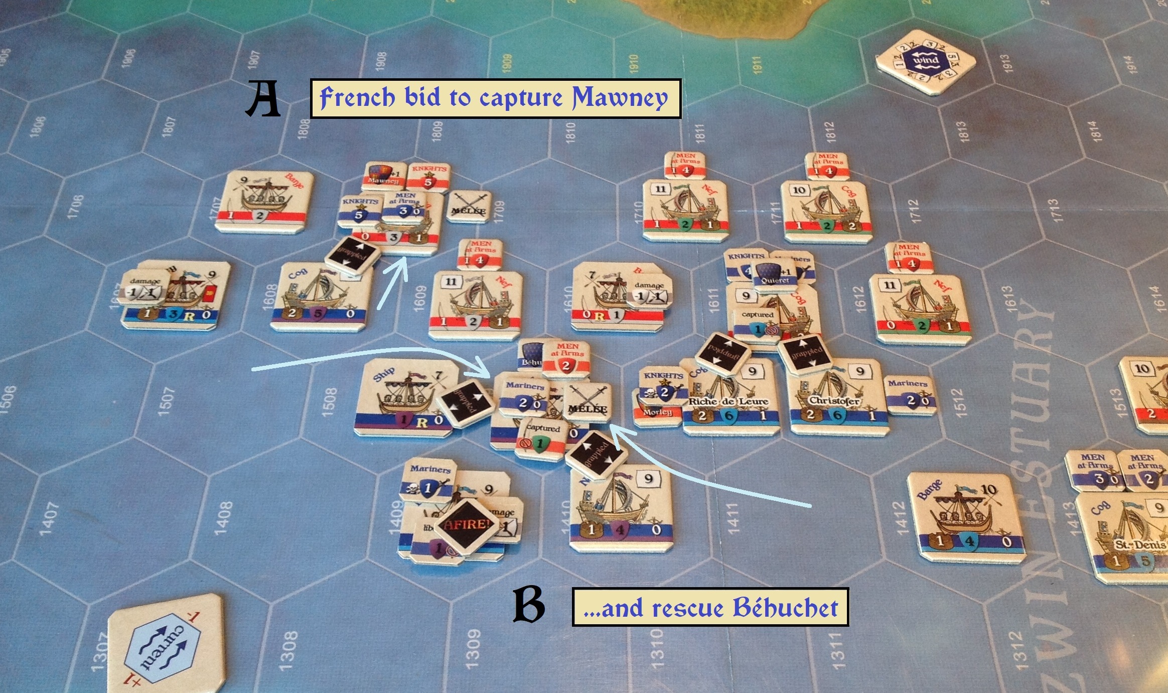 Béhuchet’s left hook too becomes a desperate matter of captives and rescue. English knight Sir Walter the Mawney’s arrival was to have swung affairs to Edward’s cause. Instead, Mawney serves as convenient target for Béhuchet’s powerful cogs (“A”) and soon will require aid himself. Nearby, the Constable’s own person falls captive to an English counterattack. His reserves rush in by oar and sail to liberate him (“B”).