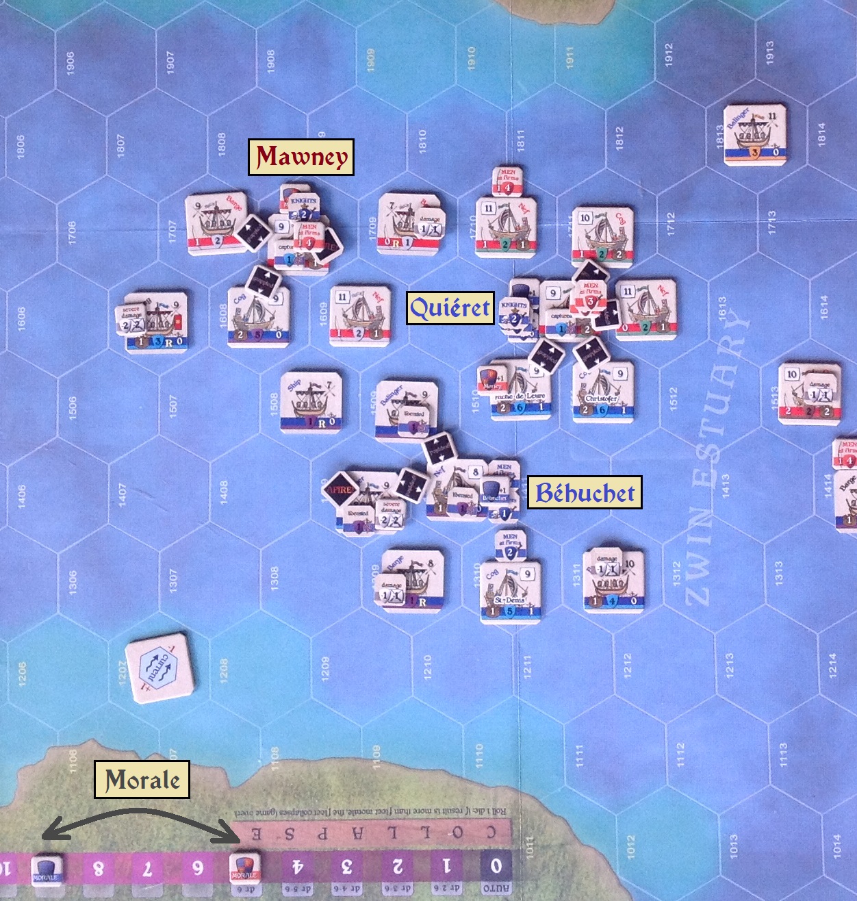 At morale 0 (“B”), the French to survive must by the End Phase either add morale via capture of a leader or 2-castle squadron or by liberating a French leader or squadron. Or they must push English morale down also to 0 for a drawn battle. None of that is possible: the English win the Battle of Sluys!