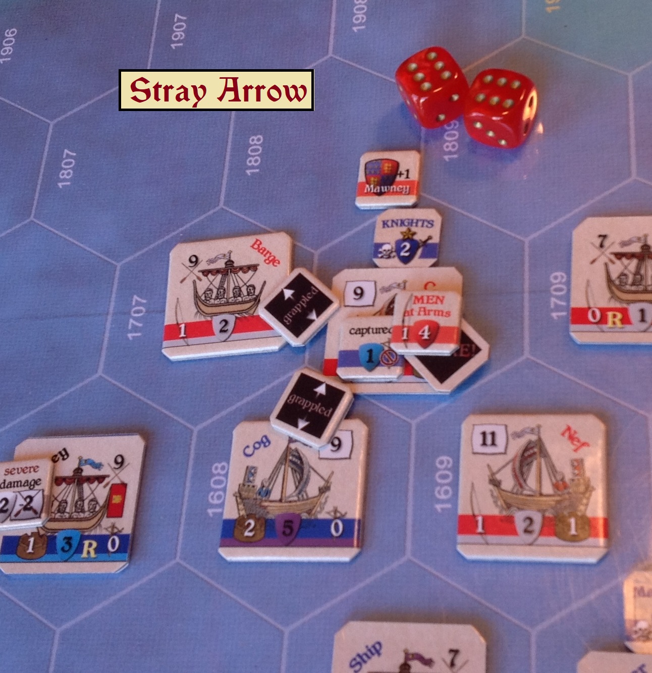 The fighting for Mawney and his ships has set some afire. Longbowmen who boarded alongside English men-at-arms aim at French knights at close range. But in the excitement, smoke, and confusion, the captive Mawney takes a friendly arrow and falls dead. (Sally archery in Mawney’s hex causes a casualty check, killing him on a roll of 12, for 1 to English morale. Had the French earlier executed him to avoid his liberation, it would have been they who suffered 1 morale for the loss of ransom.)