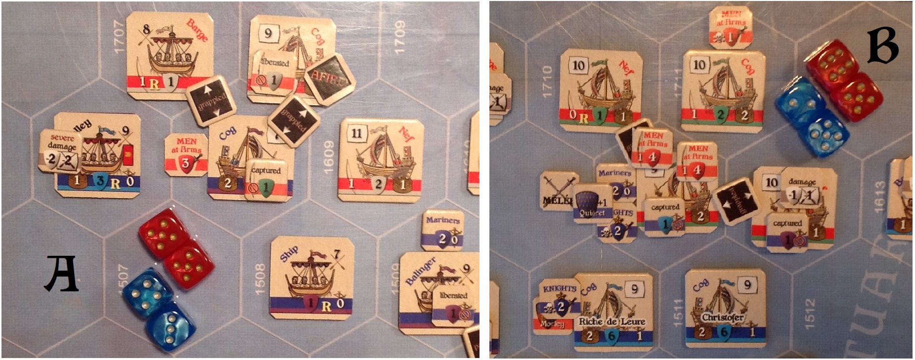 Béhuchet’s rescuers, while fresh, are less well armored as his captors. The Englishmen holding the Constable of France see an opportunity in the boarding to trade their smaller prizes—mere balingers—for castled nefs now grappled alongside. They drag their prisoner to more these defensible decks. This tactical maneuver, however, also carries them further into the French mass of ships and away from any friendly reinforcement. With Béhuchet still captive and Mawney still free, French morale verges on collapse (turn 5 ends). (A die roll above a side’s morale at turn’s end loses the game.)