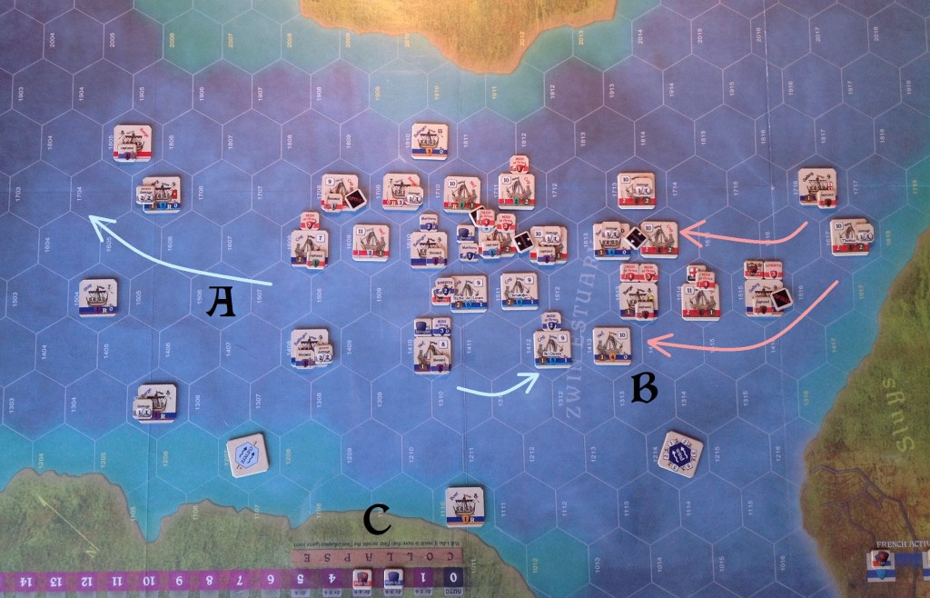 The French reserve of manpower is spent. Weakened squadrons begin to disperse and row for the North Sea to escape capture (“A”). At this moment, Edward slams his unengaged command of fresh cogs, nefs, and marines and captured galleys into the French center. The enemy can manage only a limited blocking action (“B”). But both sides can see that the other may break first, so neither yet gives in. (See “C”; there is no collapse if both sides are at less than 6 morale 5 but above 0. Turn 6 ends.)
