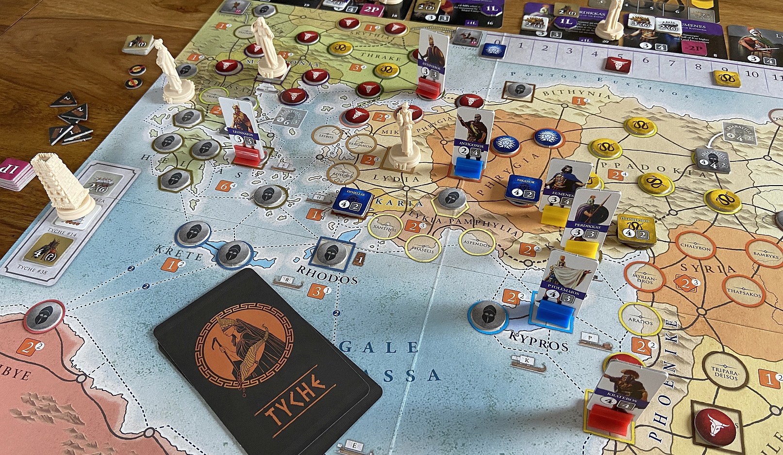 I have to underline that this is a very thematic game – covers all that grand battles of Alexander generals and not so long ago – friends & compatriots. We have Alexander legacy, heirs, prophecies, grand armies, elephants, as well as surprising event cards. As a fan of history I love to have a chance to replay it and possibly alter. Of course, new edition has great quality components – it is vividly and clearly visible when you use miniatures. Oversize Tyche cards, mounted map, province cards – all those elements adds to unforgettable experience.