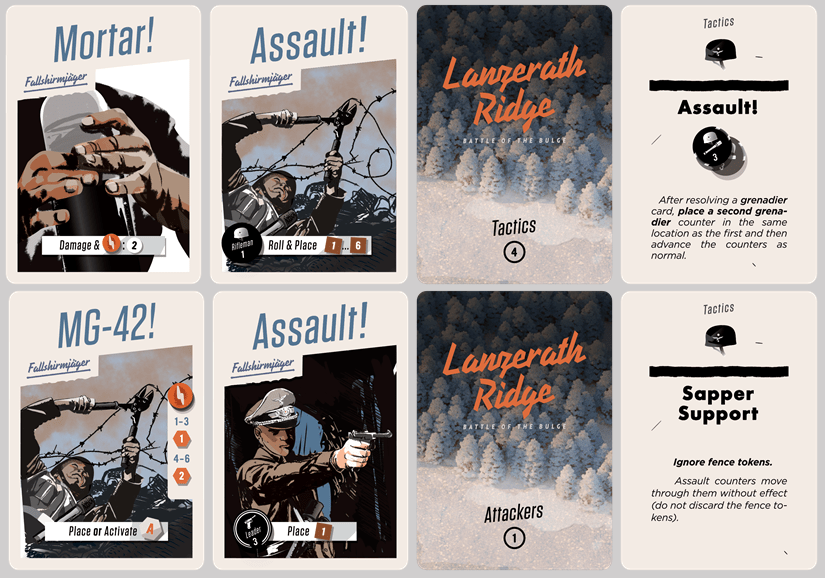 - German Phase – play 3 attack cards. There are several different categories of Cards/Enemy Actions, based on the effect: Assault (Riflemen, Grenadiers, SMGs & Leaders), MG-42 and Mortar.