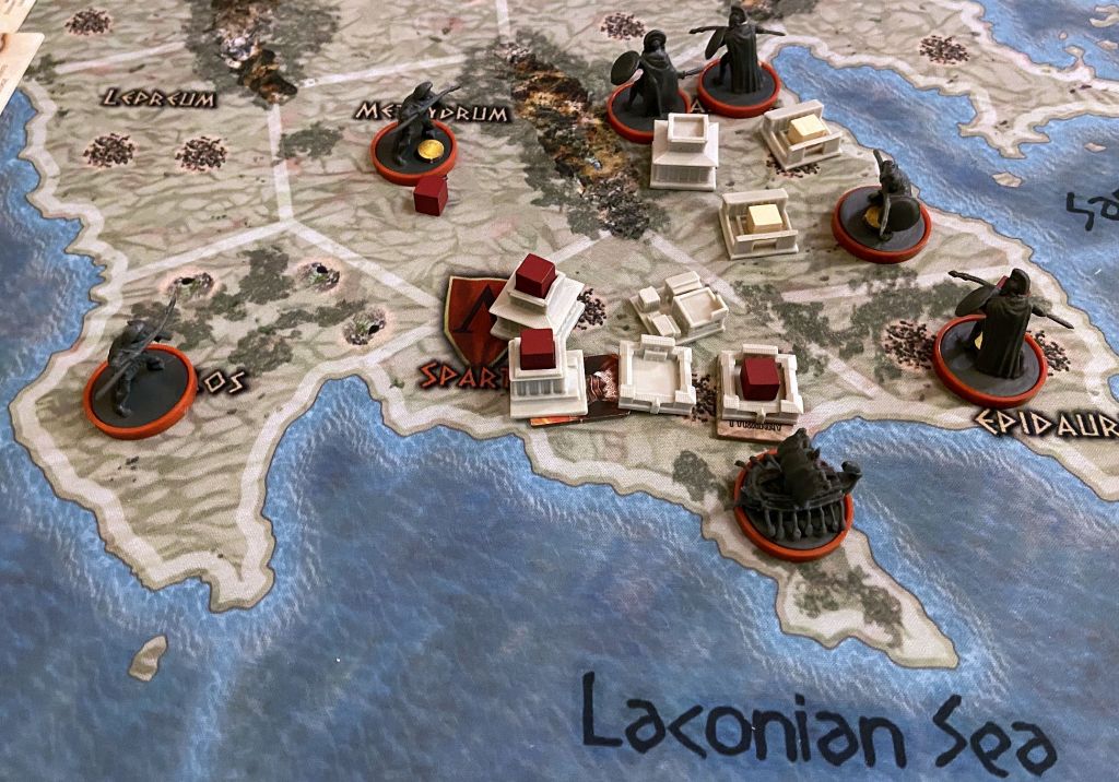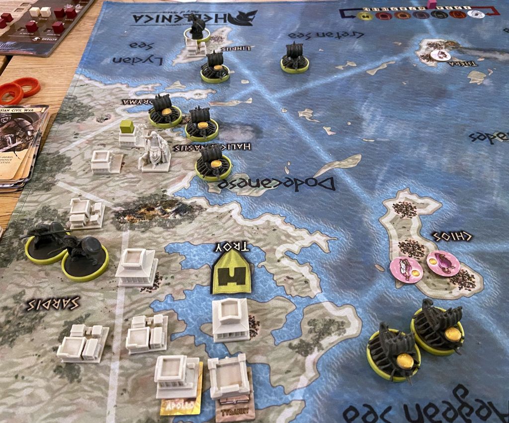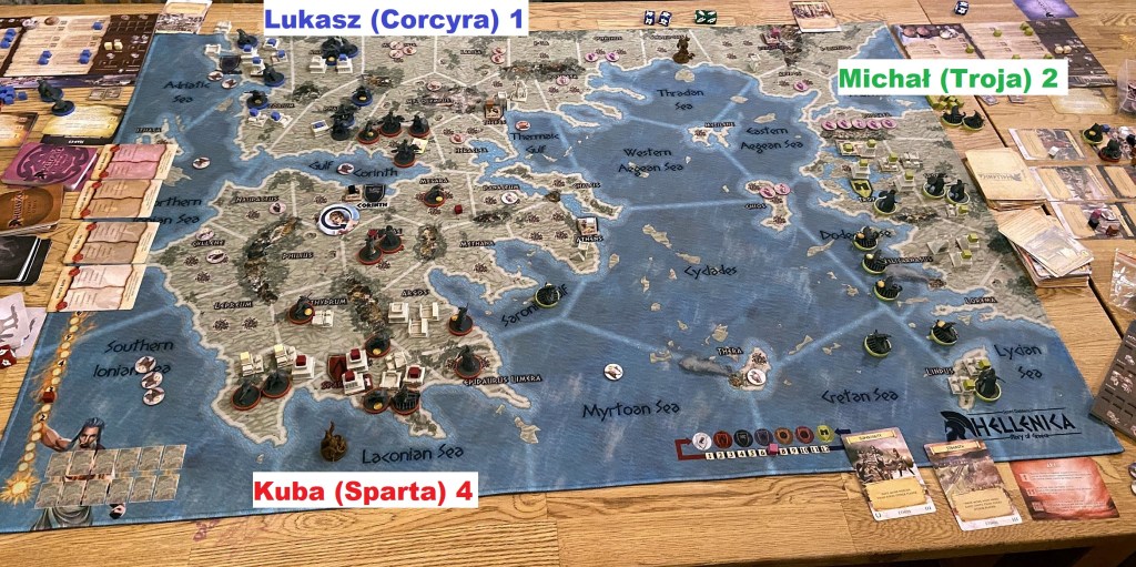 Hellenica to gra strategiczna, osadzona w starożytnej Grecji, wykorzystująca elementy rozbudowy cywilizacji, eksploracji, podboju i wypełniania częściowo ukrytych celów. Area control z ekonomią, bitwami i wypełnianiem zadań – w największym skrócie. Pięknie wydana, na olbrzymiej mapie (zobaczcie zdjęcia poniżej – musieliśmy połączyć stoły) a jednocześnie w miarę prosta do opanowania. My graliśmy we trzech (ja, Kuba i Łukasz) plus 4 boty.