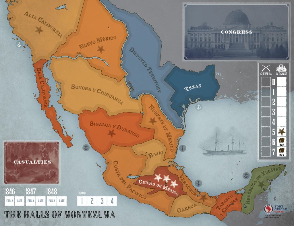 The Halls of Montezuma tasks two players to recreate this pivotal war in American and Mexican history. As the United States, you will be tasked with taking California and invading Mexico while facing mounting political opposition at home. As Mexico, you will be forced to fight a defensive war of attrition against the better trained and led American troops.