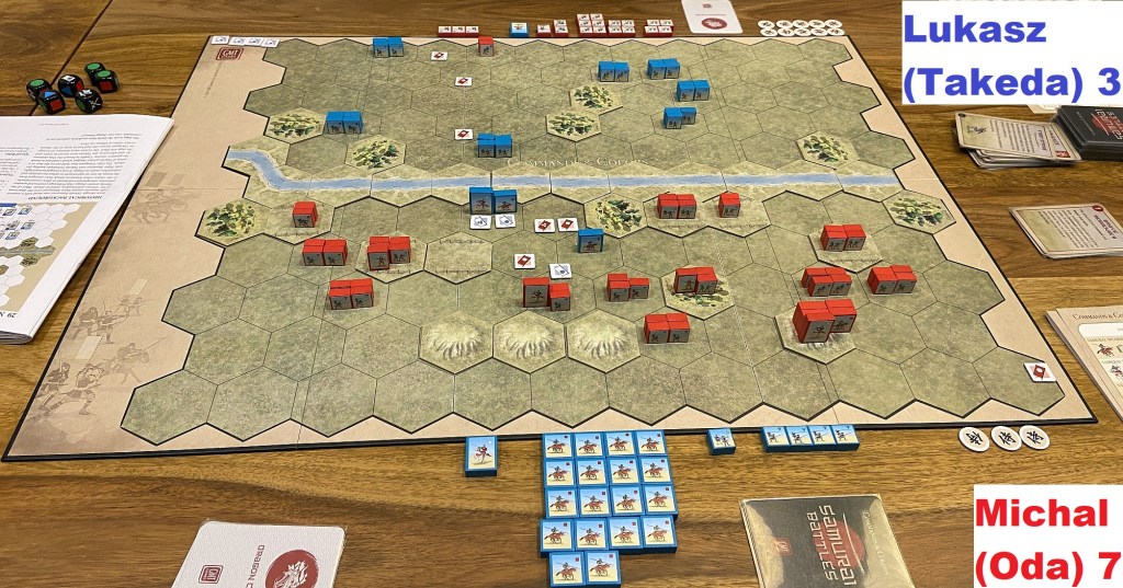 The Commands & Colors: Samurai Battles game allow players to portray important engagements of Japanese history mainly from the XVI century, before Tokugawa Shogunate. The scale of the game is flexible and varies from battle to battle. For some scenarios, an infantry unit may represent an entire clan of soldiers, while in other scenarios a unit may represent just a few brave warriors. The game follows the well-proven mechanics of Commands (cards driving the moves and creating Fog of War) and Colors (the units designation, having huge impact on battle results). The dices allows us to quickly resolve all battles and the components in the box allow for creation of countless scenarios. In essence, Richard Borg at his best!