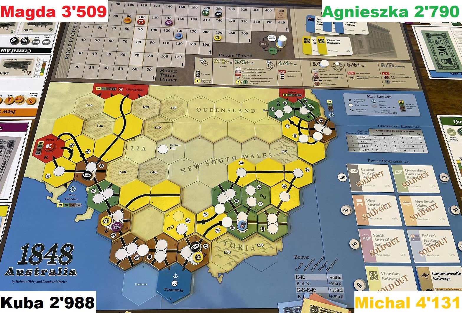 In our initial game we somehow underestimated time needed to explain the title and for the gameplay itself 🙂 You need definitely more than 2-3 hours – especially with four players and all newbies. So let us say this was a more “exploratory engagement”, to see the game mechanics in work, check how the general rules work as well as how specifics of Australian – Ghan, track gauges, The Bank of England or companies in receivership interact with the rest of the game.