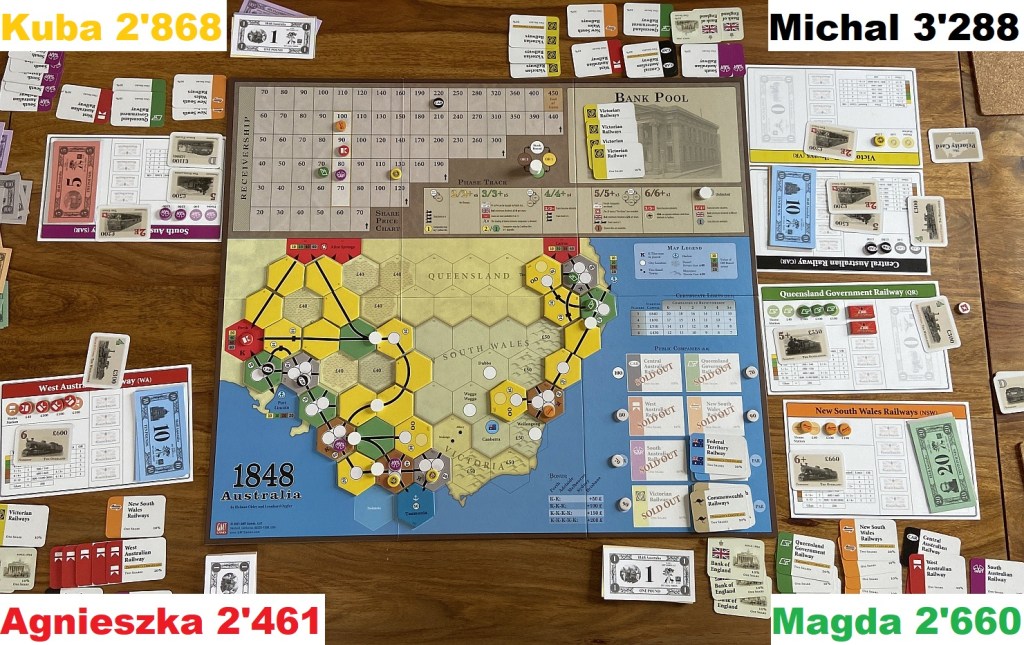 Ok, after the initial play, much better equipped and with quite good rules knowledge we jumped to another attempt. We almost finished game (it was like maybe 2-3 more operating rounds) so the below results can be treated as more or less final ones.