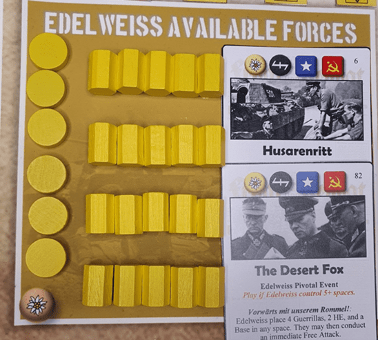 To outmanoeuvre these stronger enemies, Edelweiss have some useful tricks up their sleeve. Their false flag attacks involve stealing Soviet uniforms and attacking the Allies (or vice versa), making the Cold War rivals even more suspicious of each other. This can even trigger another world war, which will keep the superpowers very busy! Edelweiss can also infiltrate to take control of other faction’s pieces – this can sometimes be done to take control of Research or Heavy Equipment tokens. Finally, their key events and some other event cards in the deck keep Edelweiss eligible for the next turn, allowing them to maintain the initiative and follow up success with more operations. Generally speaking, they will be able act more frequently than any other faction.