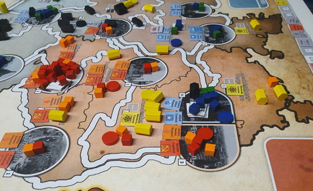 To this end, the victory condition of Edelweiss is based on total population under their control, plus their number of bases. It is important here to remember the distinction between control and loyalty/resistance. Control of a space means military dominance – your faction has more pieces (whether they are guerrillas, troops, police, bases or HE tokens) than all other factions combined. Loyalty (which could be Allied or Soviet) and resistance indicates the sympathies of the population in that space and is often entirely different to who controls it. For example, when the game begins the Allies have control of Nuremberg despite it being in a state of passive resistance, while Edelweiss control Brandenburg despite it having passive Soviet loyalty.
