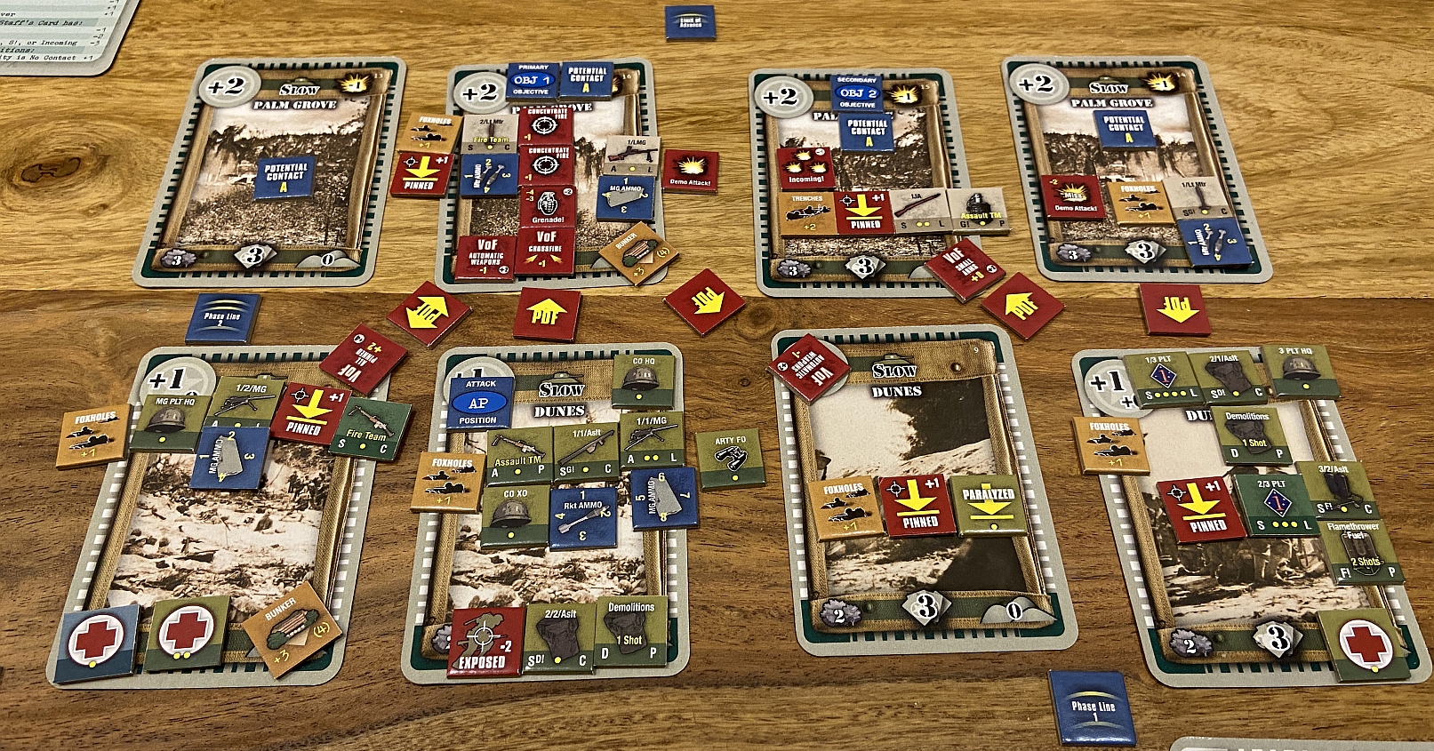 Nice review. In addition to your comments, I would add that I see the strengths of this game are: 1.) modeling FoW in a way few tabletop games do and 2.) modeling the the very real challenges to communication and coordination on the tactical level. AND those two strengths interact dynamically together. I really do think this is a game that teaches “real lessons,” meaning those that could be applied by co’s and nco’s actually working in a combat environment, about small unit combat. Designer Cole Wehrle once described a very popular tactical title as a great World War II movie version of war. This game does not deliver a “Sands of Iwo Jima” version of war. It’s more like the first fifteen minutes of “Saving Private Ryan.” And it is very possible in this version, the beach is not going to be taken, and you and many you cared about are going to be dead. And that could well be the case even if you did a “good” job of planning and preparing.