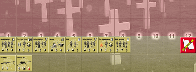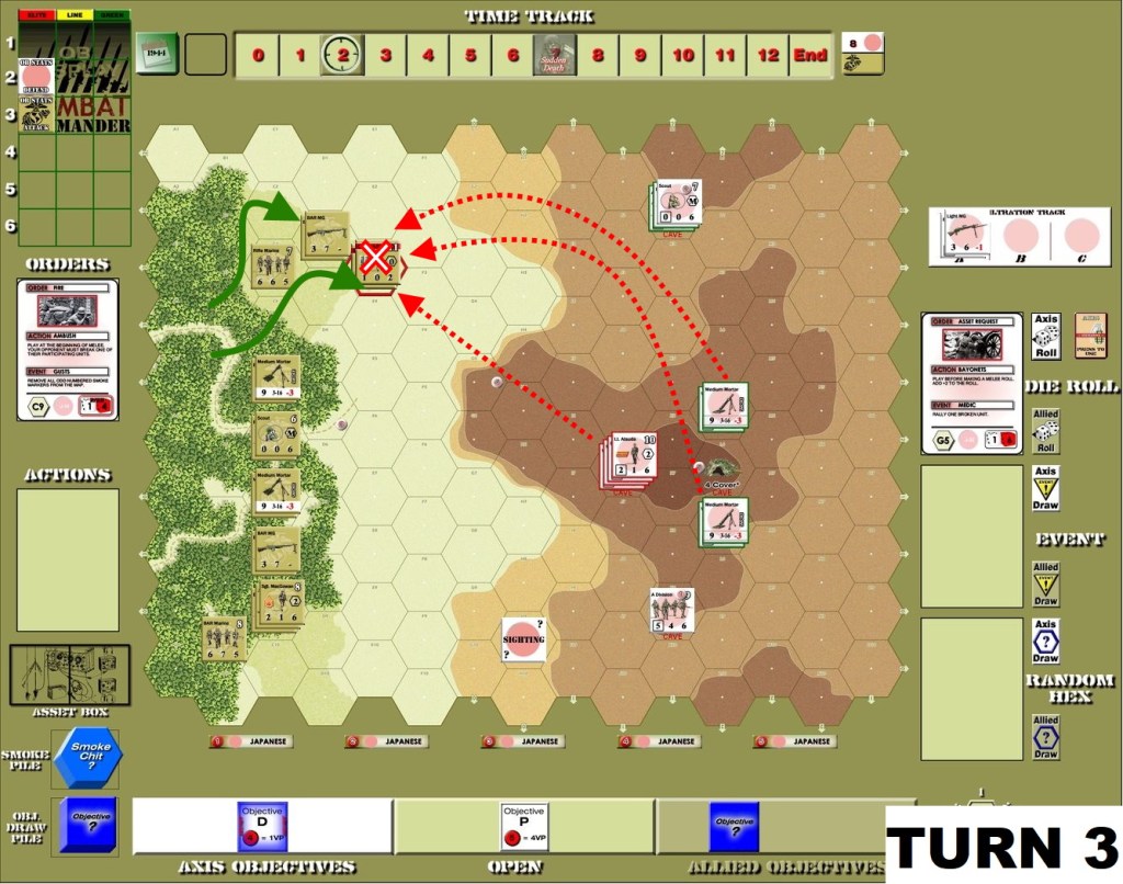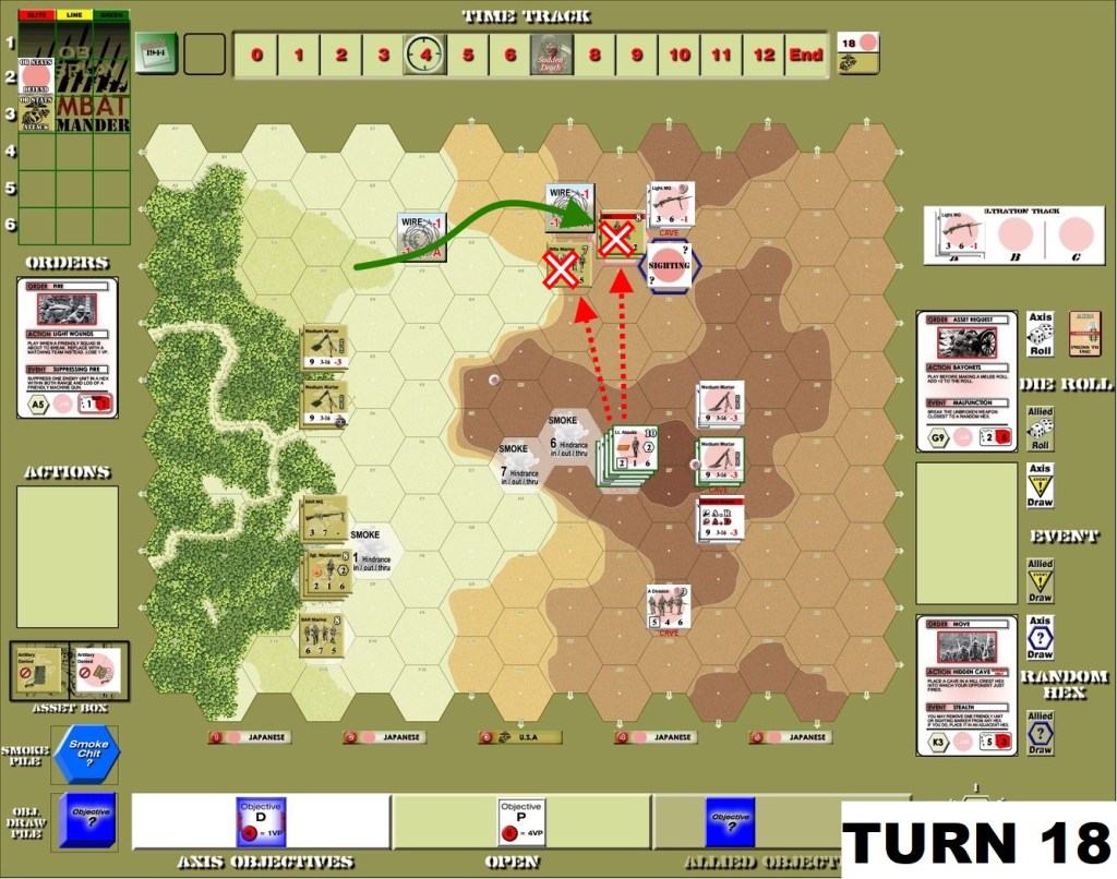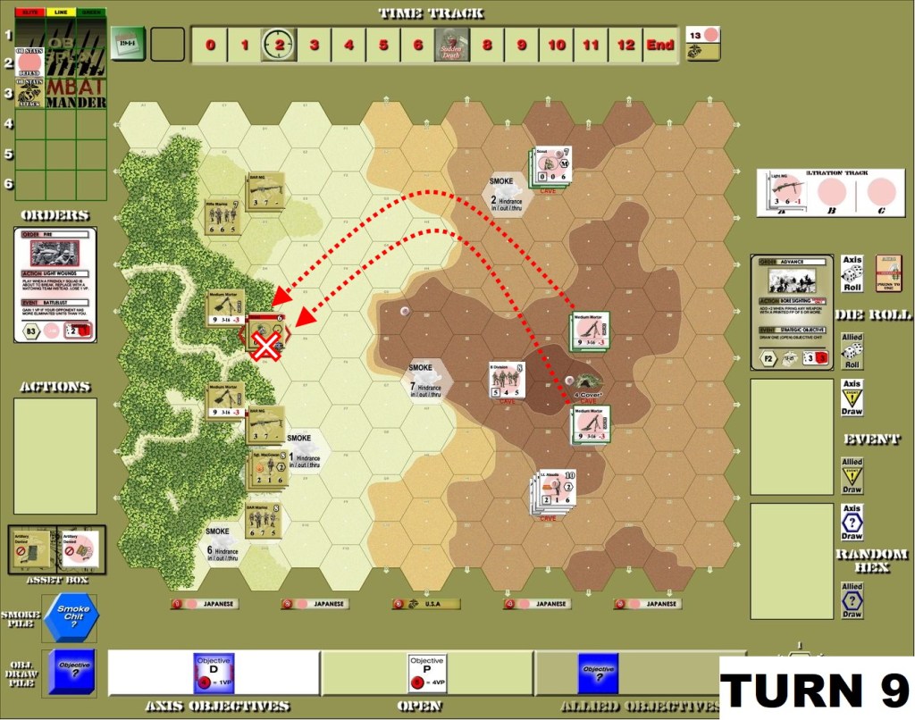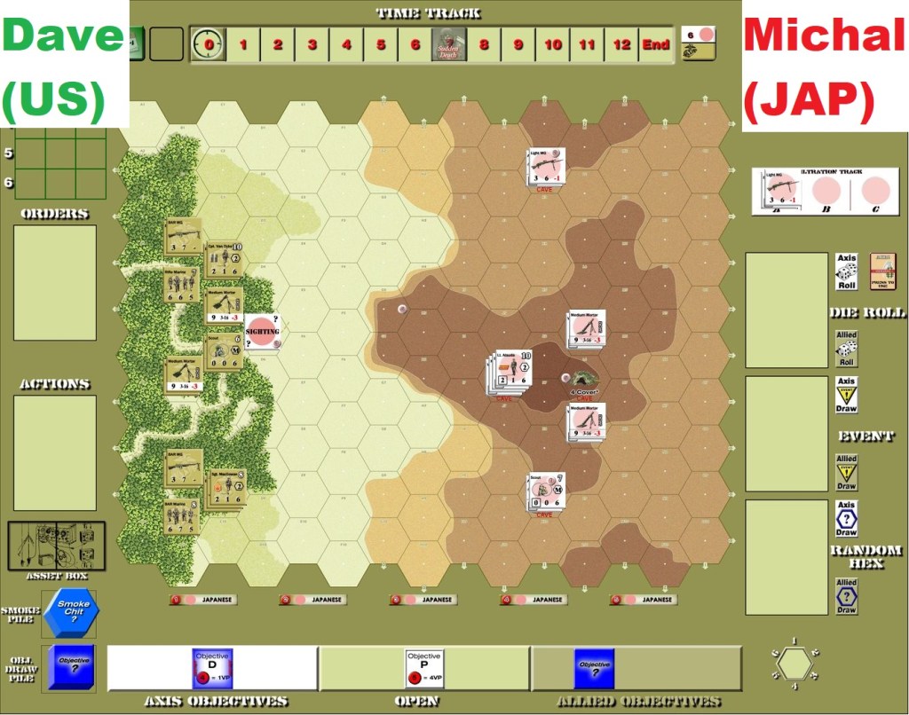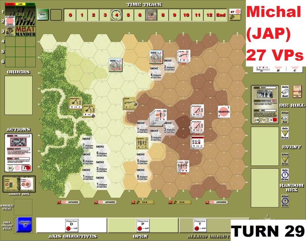 That was very frustrating scenario for Attackers. The defending Japanese seemed to have enough Fire orders to pin down and eliminate one after another the initial assaulting groups. The deep defense – as you can see above caves were placed rather in the middle and back of the ridge – proved to be great choice, keeping the US troops at distance. Only once huge amounts of smoke appeared the advance was possible – but then a melee counter-attack by defenders obliterated last hopes of successful attack.
