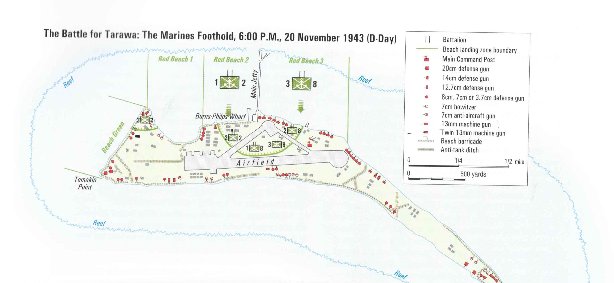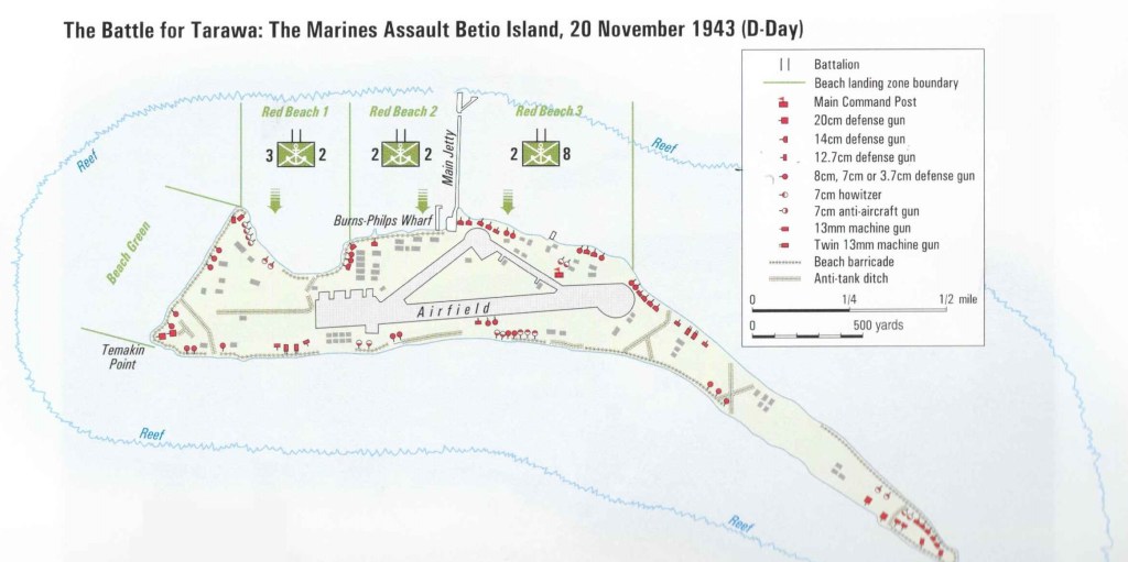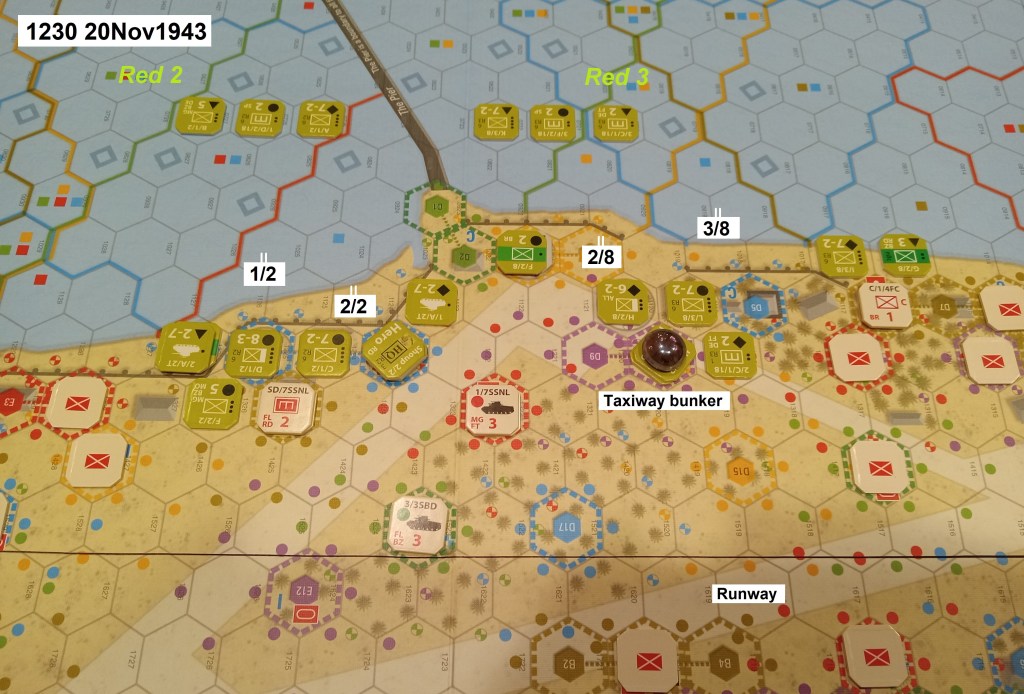 Let’s have a look at what the Marines achieved historically in the afternoon to come. Ryan in the west had forayed down Green Beach, knocking out artillery positions and scouting the ground for the next day’s intended landing there. But, short on heavy weapons, Ryan pulled back into the Beak against the anticipated typical Japanese nighttime counterattack. Shoup with the rest of 2nd and 8th Marines ashore from their consolidated Red 2 and 3 beachhead had penetrated past the taxiway into the interior triangle, but still short of the airfield runway.