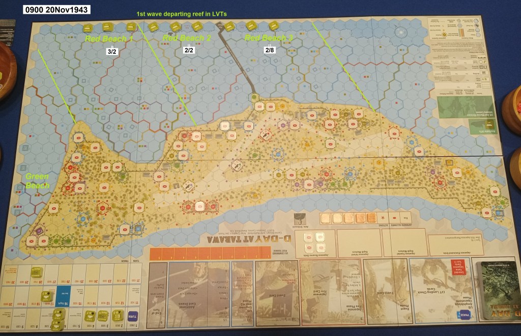 I am new to John Butterfield’s celebrated “D-Day at” series, about which you can read a great deal from Michal at the links below. As Tarawa historically saw the first major US landing in the Central Pacific, and American forces learned hard lessons there, I thought it fitting for me to jump into the full “Two Days in Hell” scenario cold. Here’s how it went, with some comparison to history and a few game-mechanic explanations along the way.