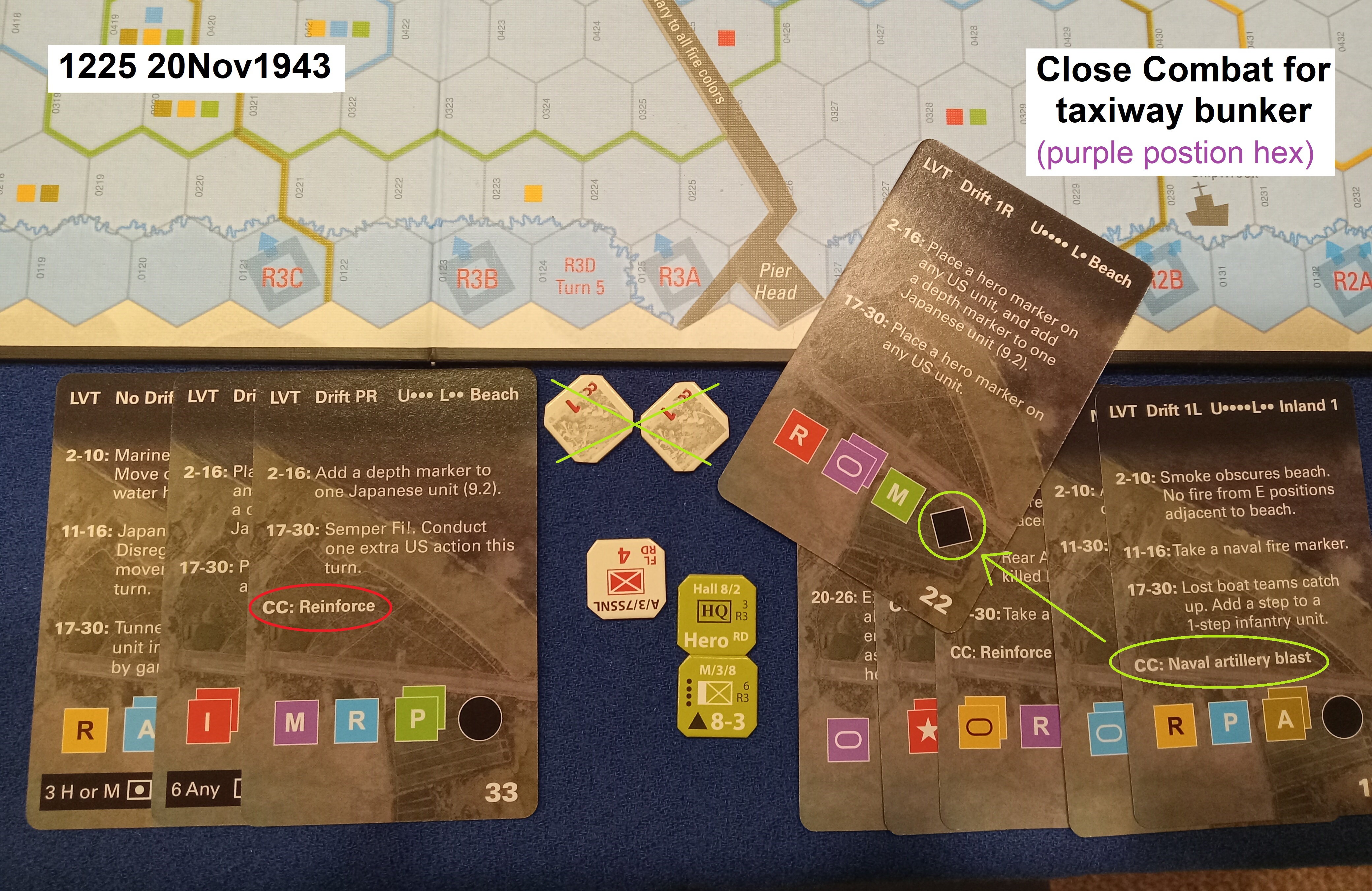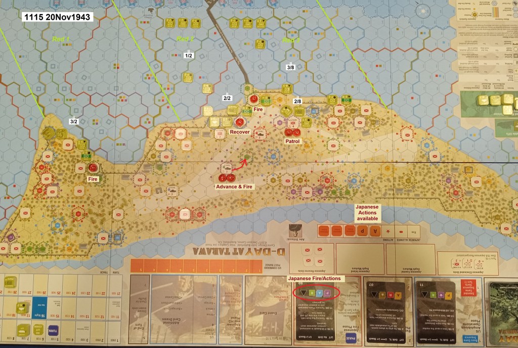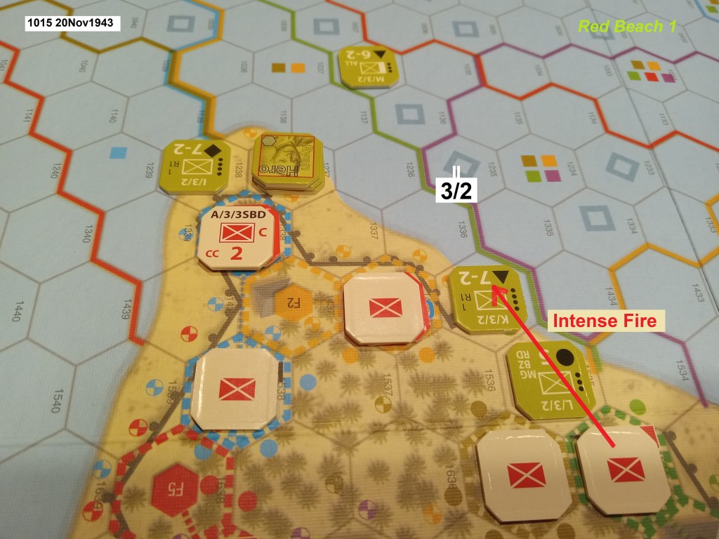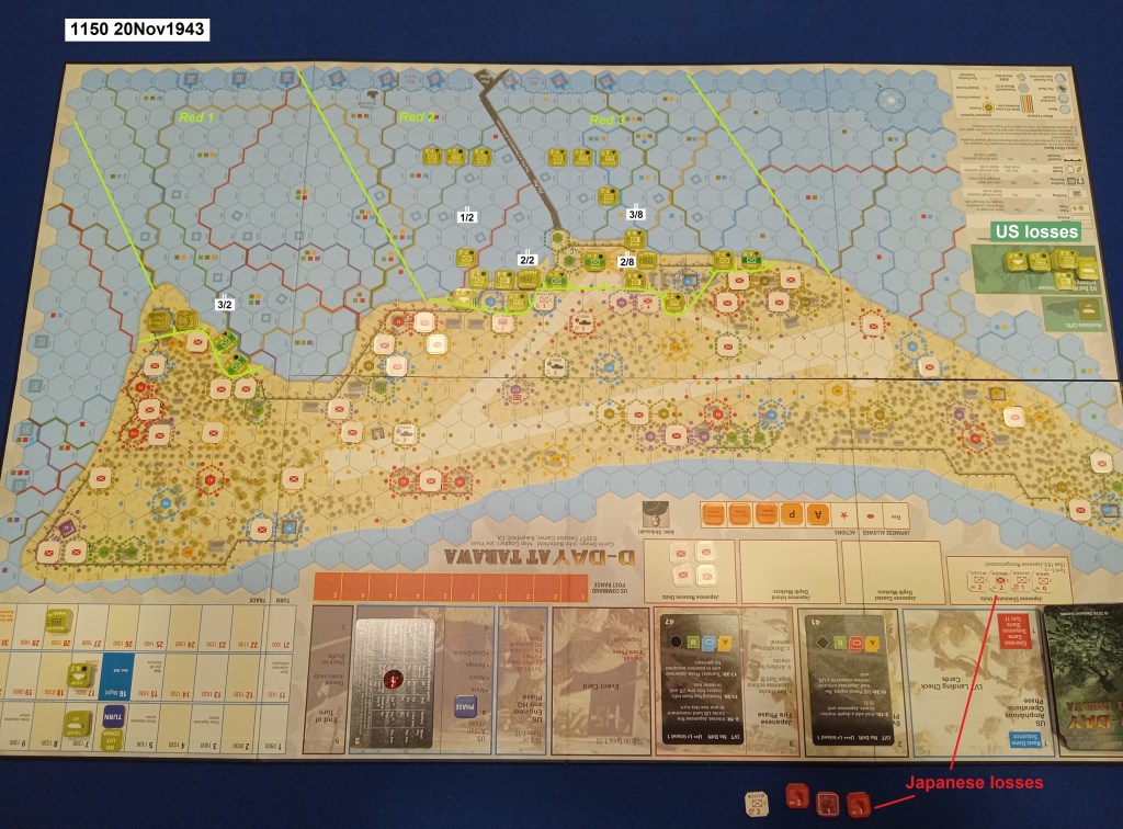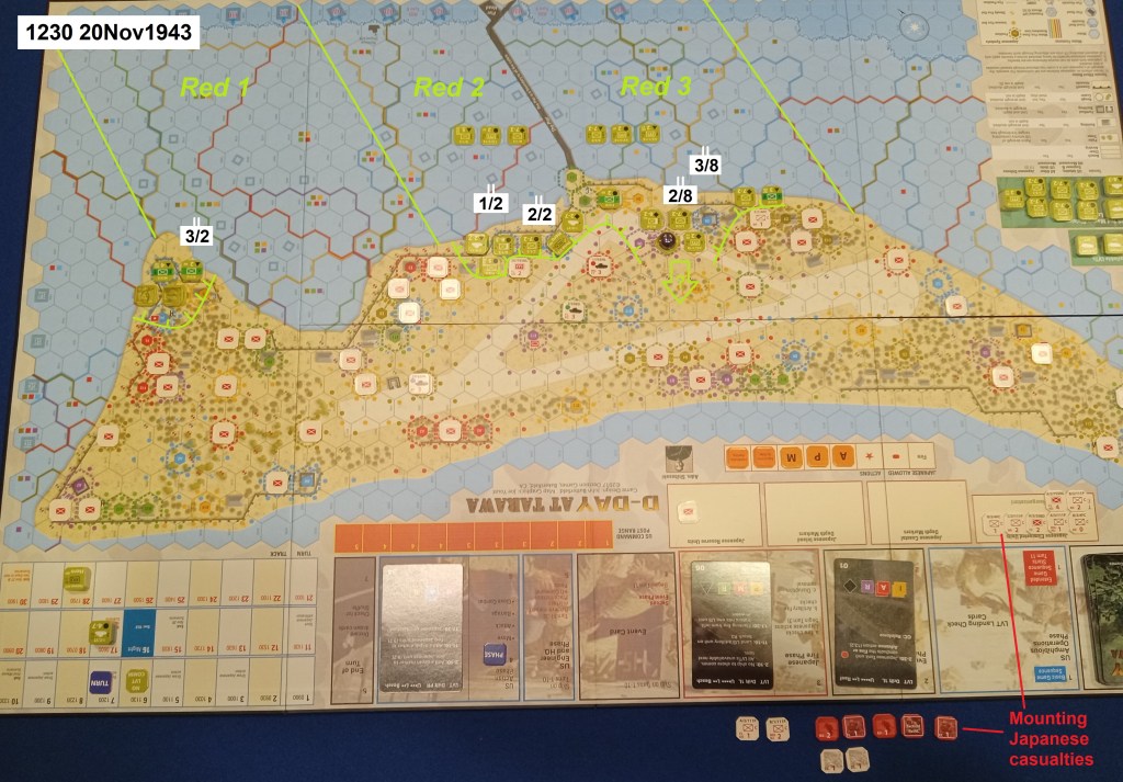 Two-and-a-half hours into the island battle, the Marines are under even greater pressure to make gains inland, so that their comrades wading ashore will not just overcrowd the narrow beach and make even greater targets of themselves. (Any hexes with more than four steps of US units are concentrated targets, more easily hit.)