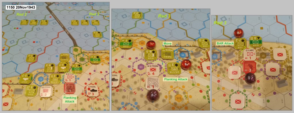 The more isolated clumps of Marines take the worse casualties, but the Japanese-built seawall is, at least, a mixed blessing: it helps shield adjacent Japanese against attack but also gives Americans on the sand some cover. On the “Bird’s Beak” of Red 1, K Company faces only “steady” fire from the enemy’s nearby (orange) position but “intense” fire from the more (green) position flanking the seawall from further up the beach.