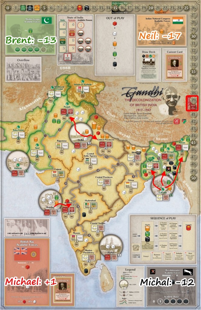 You know that I appreciate COIN games very much – and Volko Ruhnke creations in general. So it does not take long to convince me to familiarize with yet another title in the system 🙂 This time we talk about Gandhi: The Decolonization of British India, 1917–1947. I had couple of solo attempts but when Brent let me know he will be organizing VASSAL Play-By-Email game, I immediately signed for it. As it occurred, we covered main scenario twice, with first session ending up as probably my shortest COIN experience ever, and second concluding in surprising result.
