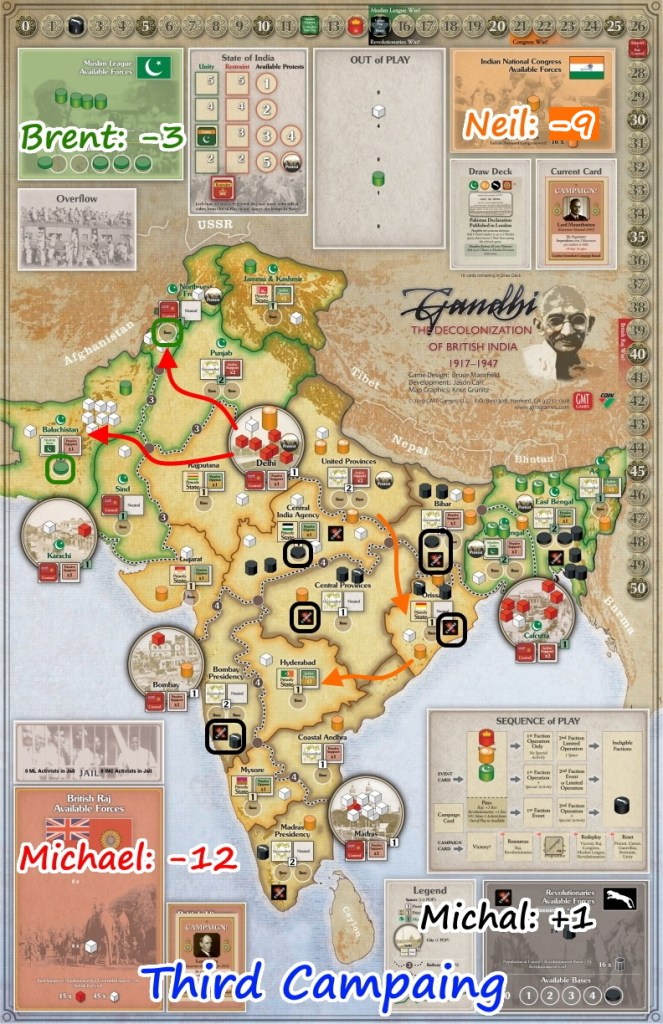 - First Campaign: We all were aware what Raj is capable of so… we played much more aggressively vs British rule than previously! That is clearly visible in VP value for Michael at the end of Campaign. My faction was far behind, still going through my newbie to Gandhi experiences. Brent was building slowly the position while Neil surprised us nicely as so far Congress was usually far away in points – here it was one of tow challengers.
