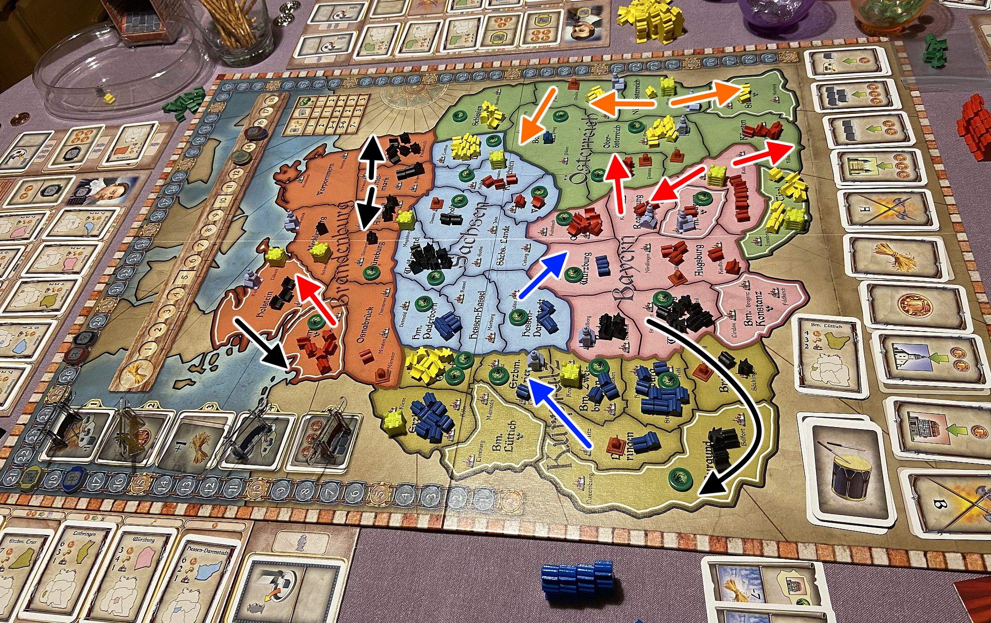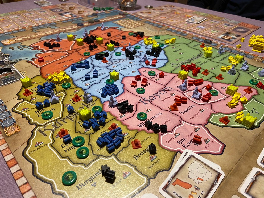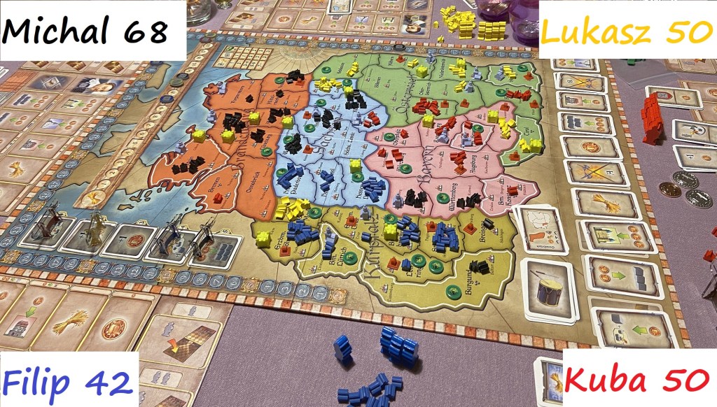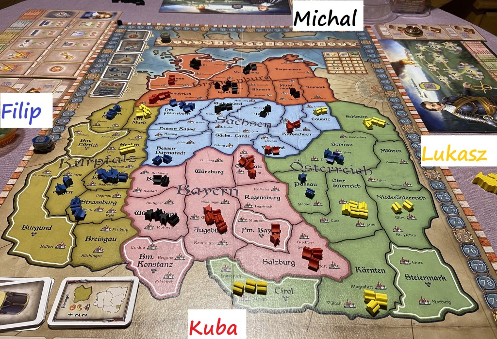 For our initial game we managed to gather group of 4 players. We decided that we shall not use all the expansions and were content with first two: Emperor’s Court (which can give some instant bonuses at the start of the round based on number of your petitioners on the court) and Landsknechte (possibility to get mercenaries if you control provinces in at least 4 regions).
