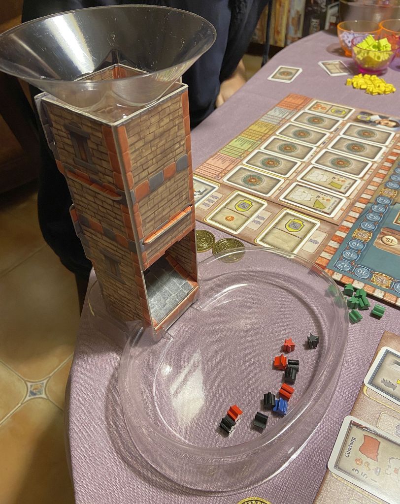 Combat and revolts are handled via a dice tower in which players drop army units and peasants (colored wooden cubes) into the top of the tower and see which ones emerge in the bottom tray (representing the fighting forces for that combat) and which get stuck in the tower’s baffles to possibly emerge in the future.