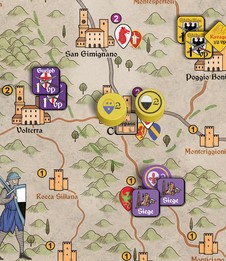 But for that, my Guelphs first somehow need to get a Treachery card. For that, they will depart Poggio Bonizio to Besiege a Castle Casole, midway south to Grosseto. (As we have seen for the Ghibellines at Montepulciano, success of Siege grants Treachery cards.)
