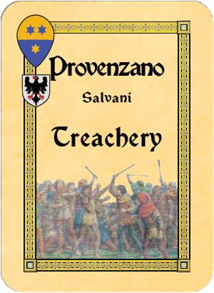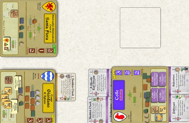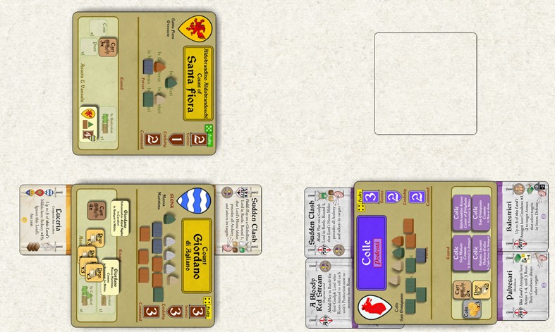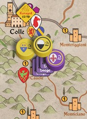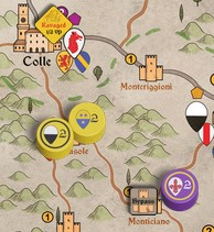 Antoine’s Ghibellines, thanks to the Surrender of Montepulciano, gained two Treachery cards. He will use those to try to bring the important Town of Colle to the Ghibelline side with a Treachery roll.