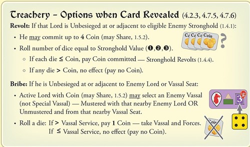 Upon a successful Revolt due to a Treachery card or after a roll on the Revolt table, players apply both bullets in this reminder box from the Revolt & Treachery aid sheet. They add or remove Allegiance markers to favor the side benefitting from the Revolt. Then the side that suffered harm from the Revolt receives an Exiles benefit. Exiles enable that player to shift its Lord cylinders (left) or Service markers (right) a total number of Calendar boxes equal to that Stronghold’s Value.