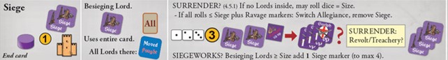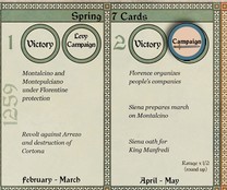 The rest of that turn would go even better for the Ghibellines: with their next card, they do a Siege action at Montespertoli. At 1 Siege marker plus 1 Ravaged marker, the Castle Surrenders on a “2”.