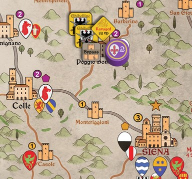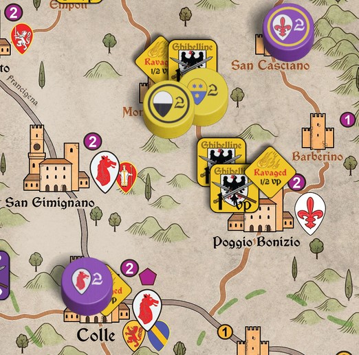 There are 2 Ghibelline (gold) Ravaged markers, so I remove one (Guelph player’s choice). There is only 1 Guelph (purple) Ravaged marker, so none are removed. (The rule is to reduce to half the number on the map, rounded up.)