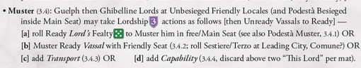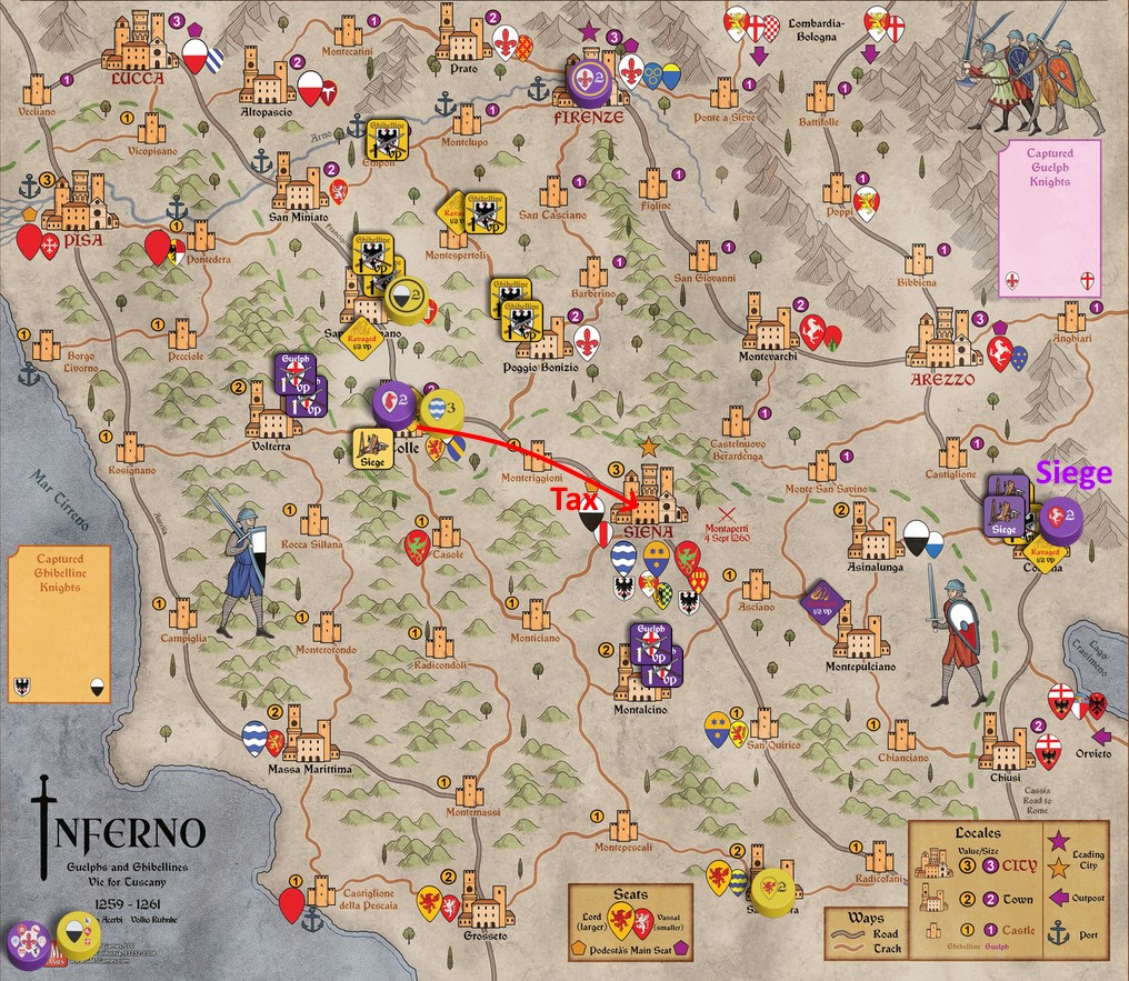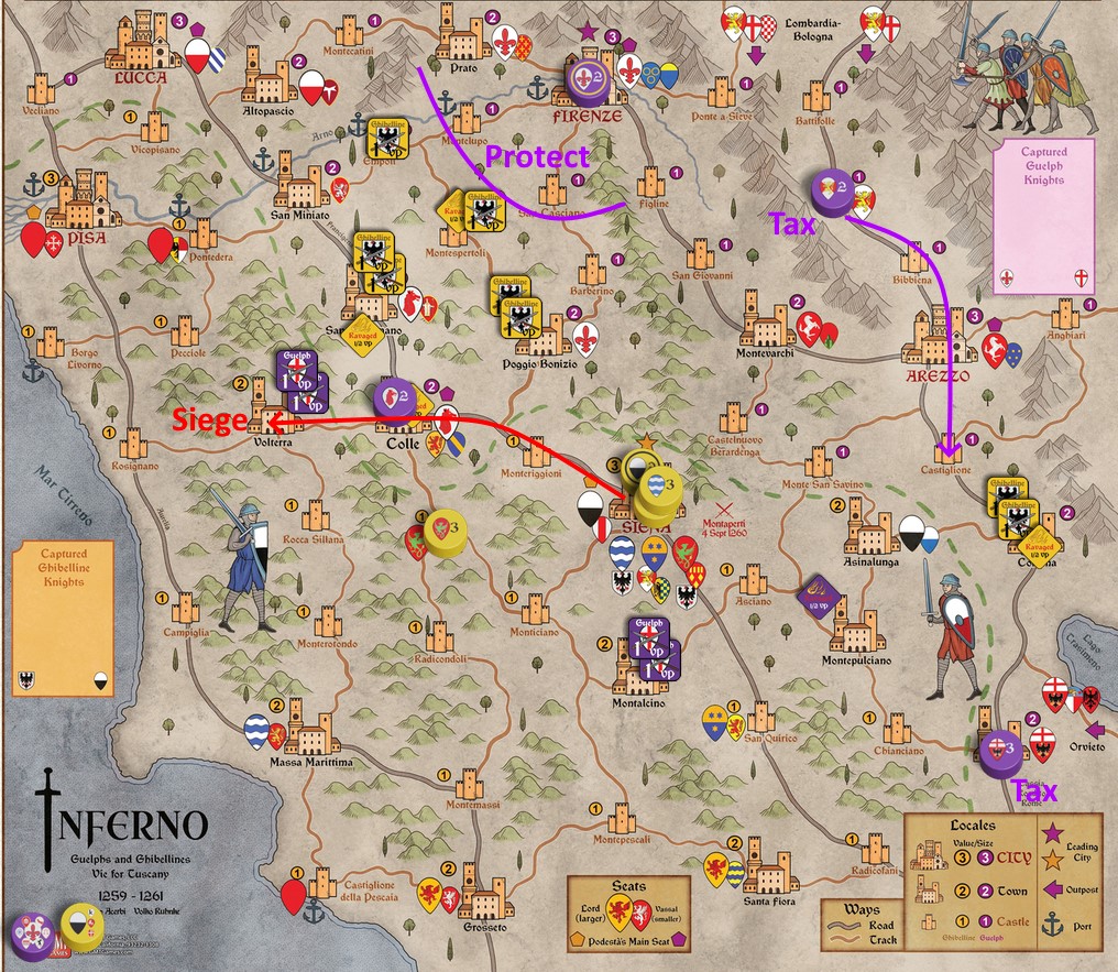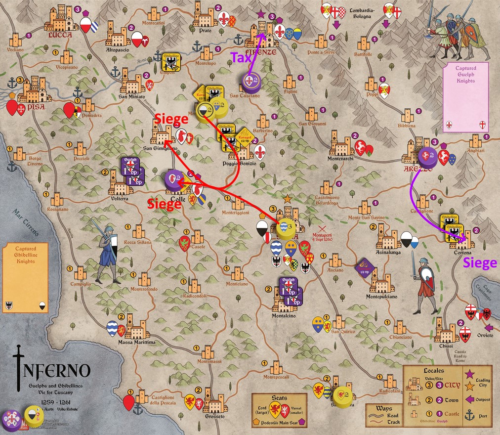 Another of Inferno’s differences from Nevsky, first game in the Levy & Campaign Series, is that Podestà Lords (the mayors of Siena and Pisa for the Ghibellines; Firenze, Colle, Arezzo, and Lucca for Guelphs) are able to Muster while being Besieged in their Main Seat (the Cities named on the Podestà mats, shown by a gold or purple pentagon symbol next to the Seat coat of arms. This is one of several Podestà Muster exceptions, summarized on the Sequence of Play sheet, this one known as “Emergency Army”.