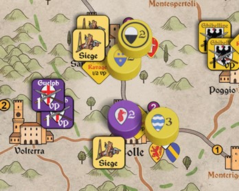 The Ghibellines during Campaign Planning decide to assign the fast-moving Count Giordano as Lieutenant over the local Count of Santa Fiora, to enable their combined advance on Volterra. This places Giordano’s cylinder on top of Santa Fiora’s, meaning that Santa Fiora cannot activate this Campaign but will accompany Giordano on his Marches. A Lieutenant, like Giordano here, must be assigned at the beginning of the Campaign and must always move with his Lower Lord (Santa Fiora in this case), whether during March, Withdrawal into a Stronghold, Avoiding Battle, Retreat, or Sail. The Ghibelline side will not be allowed to use Santa Fiora’s cards this Campaign, only Giordano’s.