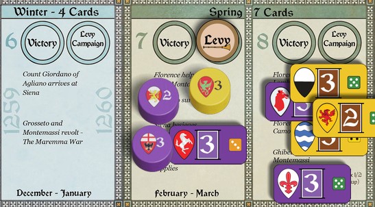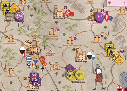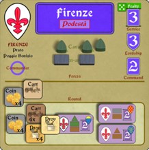 In contrast, the Podestà of Siena—the Ghibellines’ Leading City—is a Commander (same as a “Marshal” in the earlier games). So he can choose to take along or leave behind anyone as he Marches. But as a Podestà, Siena’s Lord is also more expensive to keep in the field—at a cost of 2 Coin per turn instead of the usual 1 Coin. Probably for that reason, Antoine has chosen Giordano instead of Siena to carry the offensive forward.
