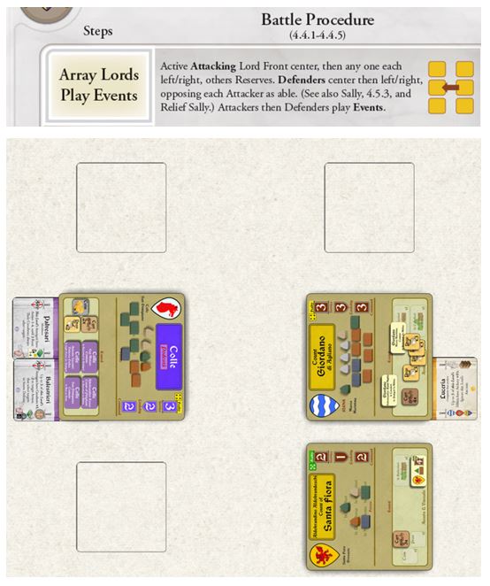 The Active Lord is the Lord whose Command card is currently in play—that Lord must deploy Front and Center in the Battle Array of up to 3 Lords across. Giordano will be in Front Center, and Santa Fiora at Front Left. The Defenders, Colle alone here, then must, if able, put one Lord in front of each Front Enemy Lord, first in the Center. Colle will face Giordano, and Santa Fiora will Flank Colle.