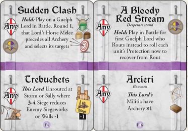 - Typically, a Lord receiving Hits selects which of his units will absorb them. But here, thanks to the Colle’s use of the SUDDEN CLASH Event, the Guelph player (me) gets to select which of the target Lord’s units will take those Hits.