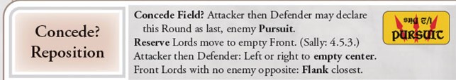 Either player now may Concede the Field. Conceding enables a side to end the fight and cover its Retreat. Its Hits will be halved, but it will pull off a more organized Retreat out of the Battle Locale. The Conceding side will get away with its Assets (Carts, Provender, and Coin) rather than have the Enemy catch and take them. It also will make much less likely its panicking Troops getting obliterated by the Enemy—which potentially can remove the Retreating Lord himself.